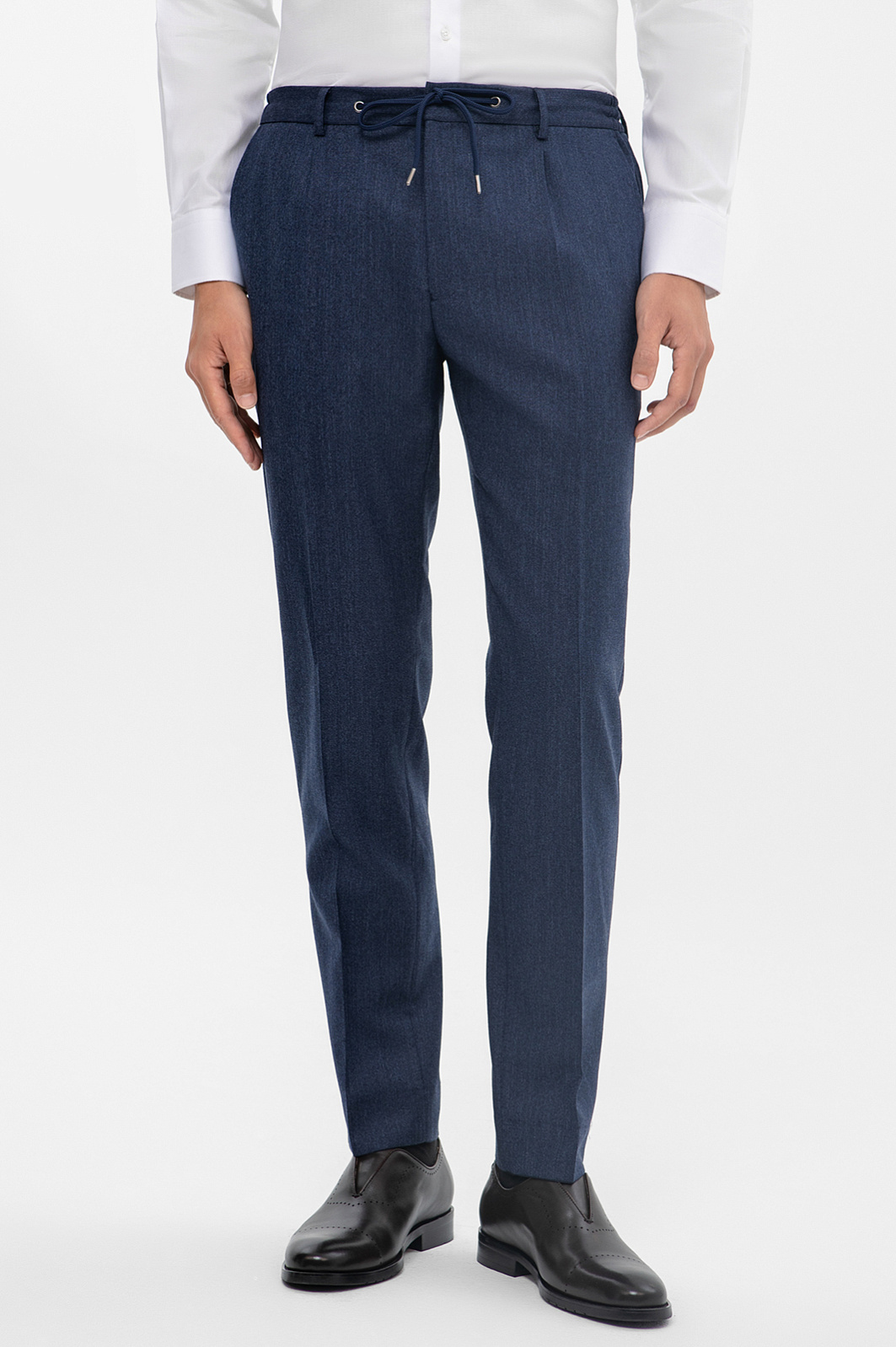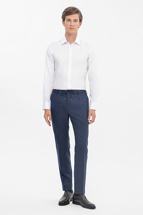 Классические приталенные брюки KANZLER из натуральной шерсти в насыщенном синем оттенке — основа для создания элегантного классического образа. Высококачественная шерсть Супер 120S отличается мягкостью, лёгкостью и прочностью и обеспечивает изысканный внешний вид. Глубокий синий оттенок придаёт брюкам универсальность: они легко сочетаются c рубашками, сохраняя при этом строгий и презентабельный вид. Помимо премиального состава, одно из главных преимуществ изделий - регулируемая посадка на кулиске. Такое современное решение позволяет регулировать степень прилегания на талии и обеспечивает максимальный комфорт. Дополните образ жилетом и пиджаком в тон, чтобы создать гармоничный образ, который идеально подойдёт для деловых встреч, официальных мероприятий или торжественных событий. Этот комплект поможет выглядеть безупречно и уверенно в любой ситуации, оставаясь на пике стиля. Параметры модели: рост 191, 97-77-99 Размер на модели: 50