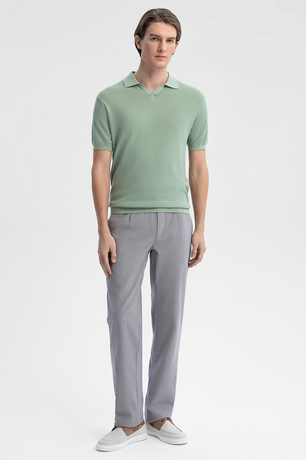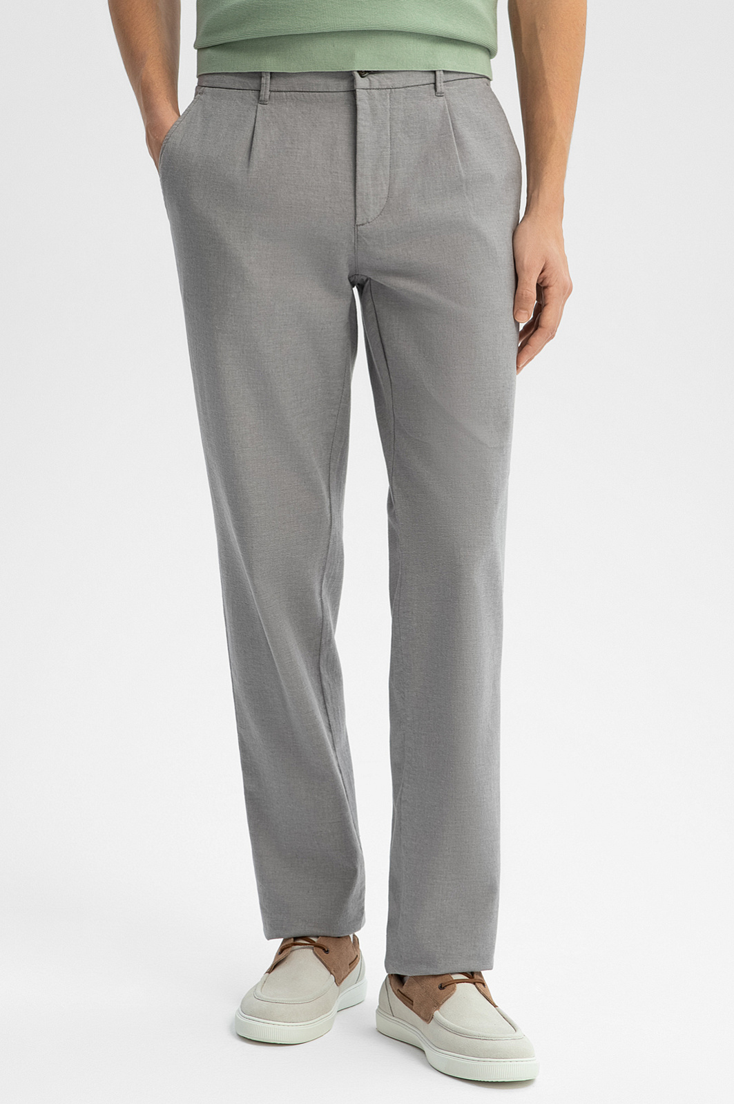 Светло-серые брюки KANZLER из хлопка и льна идеально подходят для теплых дней и привносят в повседневный образ легкость и непринужденность. Умеренно свободный крой с легкими защипами задан прямыми линиями, вытягивающими силуэт вверх. Брюки сшиты из дорогой смесовой натуральной ткани. Прослойка воздуха, которую сохраняют хлопковые волокна, поддерживает оптимальную для тела температуру в прохладные и теплые дни. Лен придает материалу прочность и приятно охлаждает кожу в жаркий день. Эластан (2%) помогает поддерживать безупречную форму. Параметры модели: рост 191, 97-77-99 Размер на модели: 50