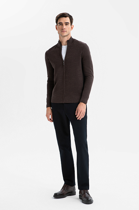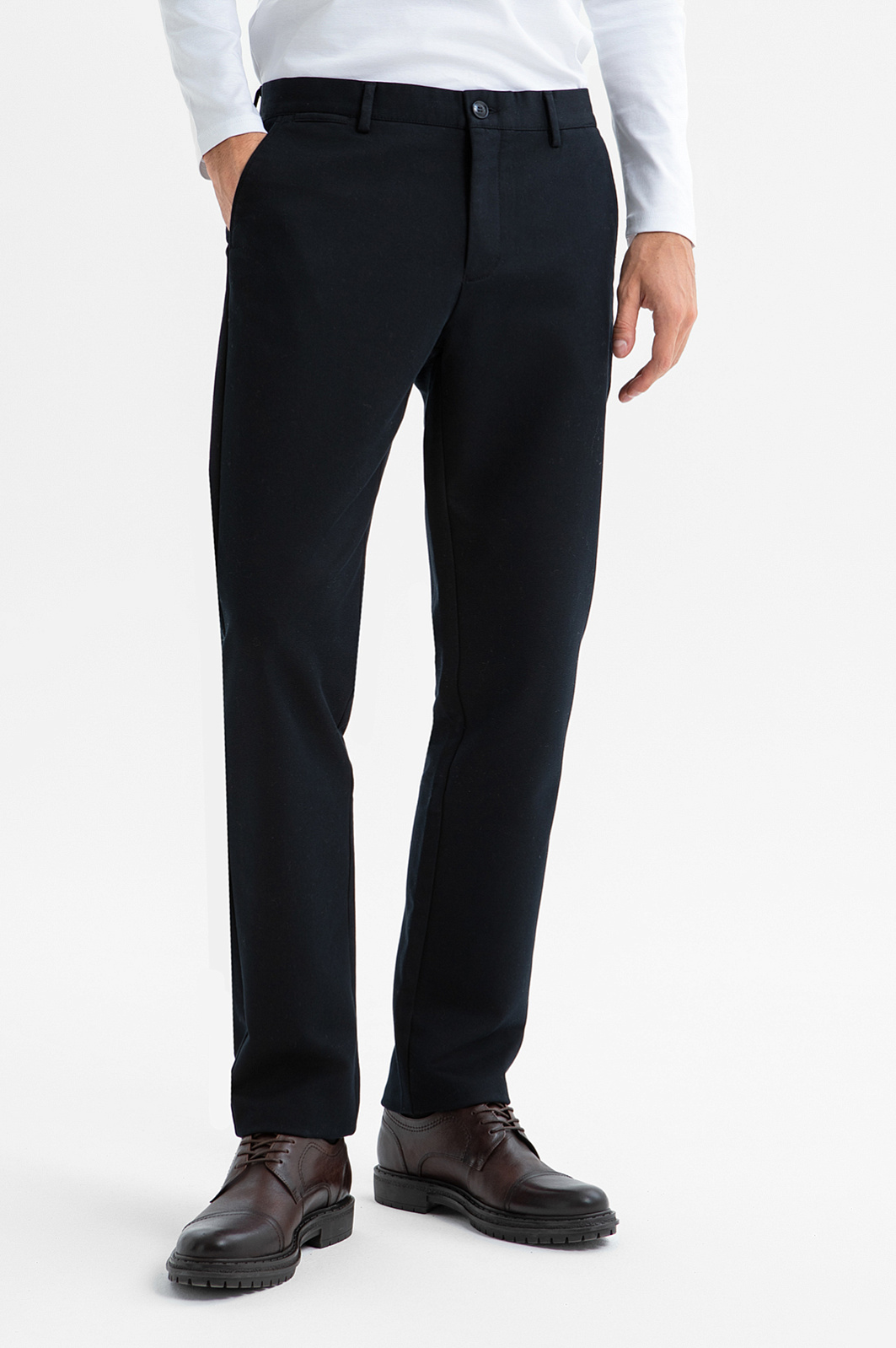 Брюки KANZLER глубокого тёмно-синего цвета — универсальная база, которая легко вписывается в деловой и повседневный городской гардероб. Прямой крой делает силуэт стройным и аккуратным, позволяя сочетать модель как с классическими пиджаками, так и с более расслабленными трикотажными и вязаными вещами. Ткань содержит 46% хлопка, 52,5% полиэстера и 1,5% спандекса — такой состав обеспечивает комфорт, воздухопроницаемость, прочность и лёгкую эластичность. Гладкая подкладка из хлопка и полиэстера улучшает посадку и поддерживает опрятный вид брюк. Параметры модели: рост 192, 101-76-97 Размер на модели: 50