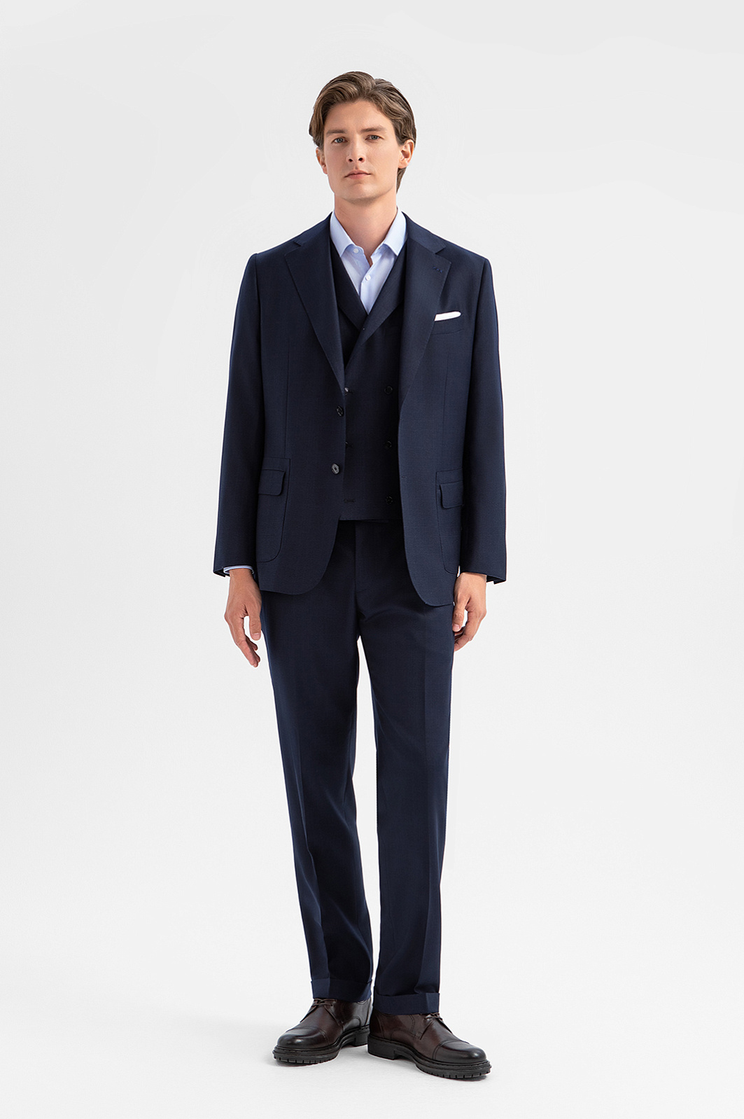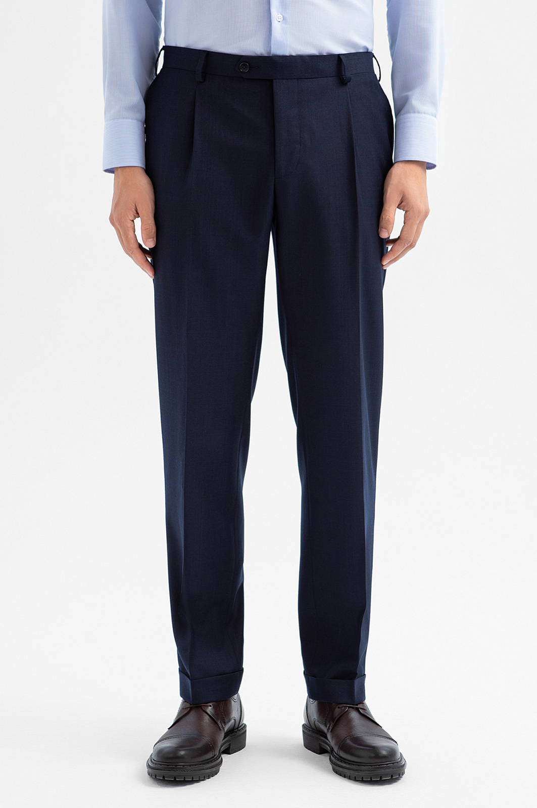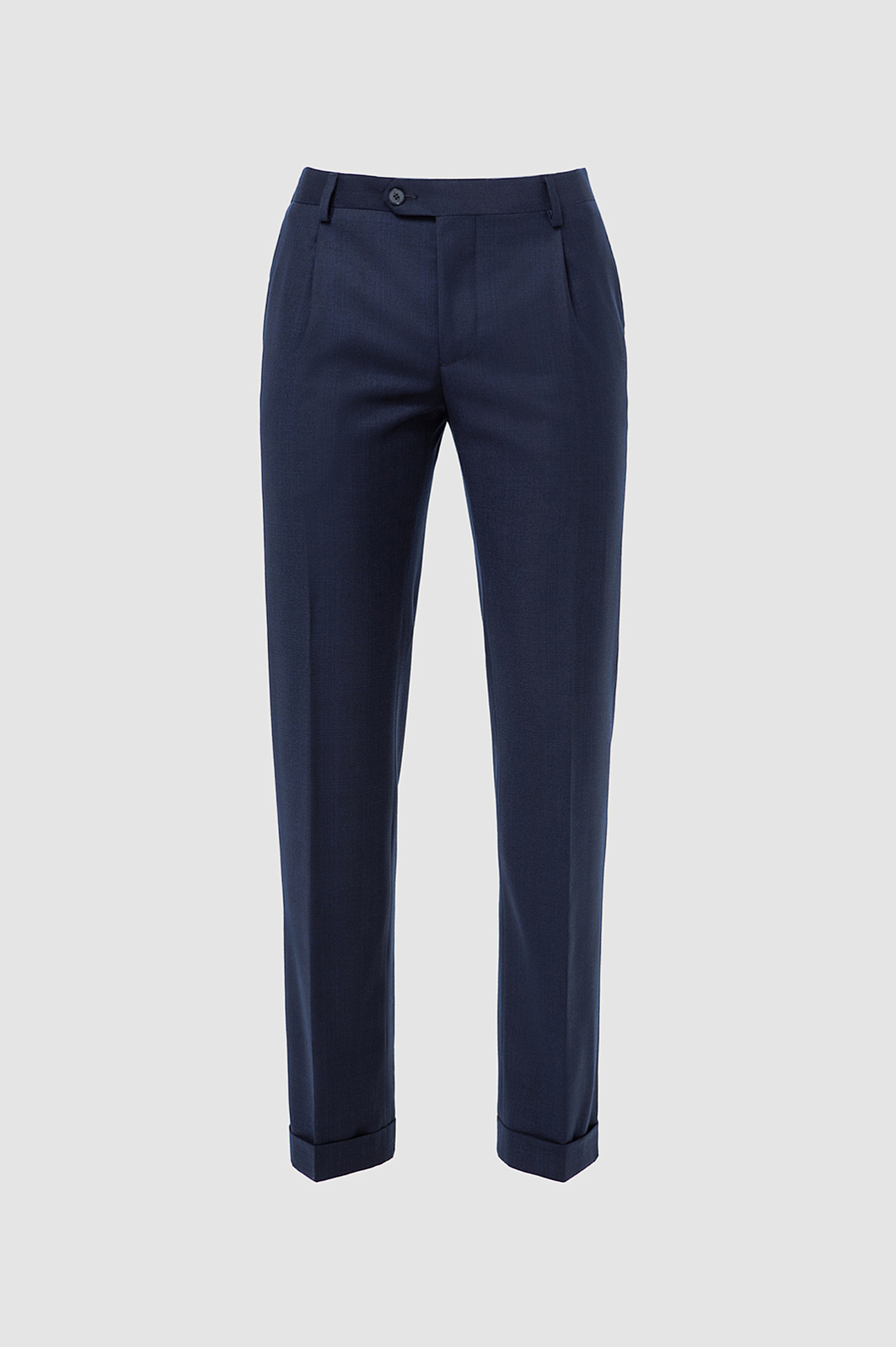Классические тёмно-синие брюки KANZLER со стрелками из лимитированной коллекции, выполненные из благородной костюмной шерсти с добавлением нежного кашемира, — воплощение сдержанной элегантности и роскоши. Они одинаково уместны для деловых встреч, официальных мероприятий и вечерних выходов. Удобная модель с аккуратными защипами у пояса имеет слегка зауженный силуэт. Чёткие стрелки задают вертикальные линии, а отвороты внизу добавляют современный акцент. Дорогая натуральная ткань (90% шерсть и 10% кашемир Супер 130S) с водоотталкивающей обработкой бережёт естественное тепло тела и сохраняет устойчивость к загрязнениям и сминанию. Прочная гладкая подкладка обеспечивает комфорт и лёгкое скольжение при надевании. Параметры модели: рост 191, 97-77-99 Размер на модели: 50