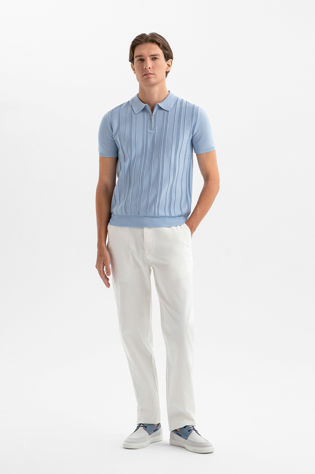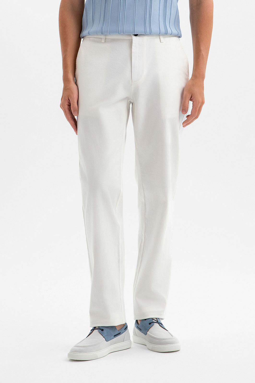 Белоснежные брюки KANZLER из хлопка — пример стильного минимализма. Они созданы для спокойного безмятежного отдыха, когда дела поставлены на паузу, а телефон переведён в беззвучный режим. Белый цвет придаёт любому образу свежесть и чистоту. Прямой крой формирует уверенный силуэт. Контрастные пуговицы выступают выразительным акцентом, не нарушая общей элегантности. Ткань сделана из воздухопроницаемого гипоаллергенного хлопка (98%), который обеспечивает телу комфорт. Добавка спандекса (2%) придаёт лёгкую эластичность, позволяя брюкам адаптироваться к индивидуальным особенностям фигуры и сохранять форму в течение дня.
