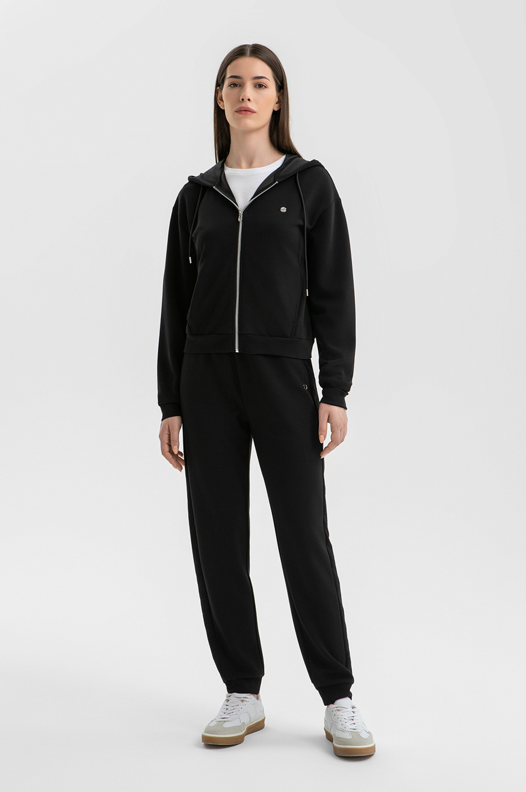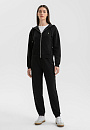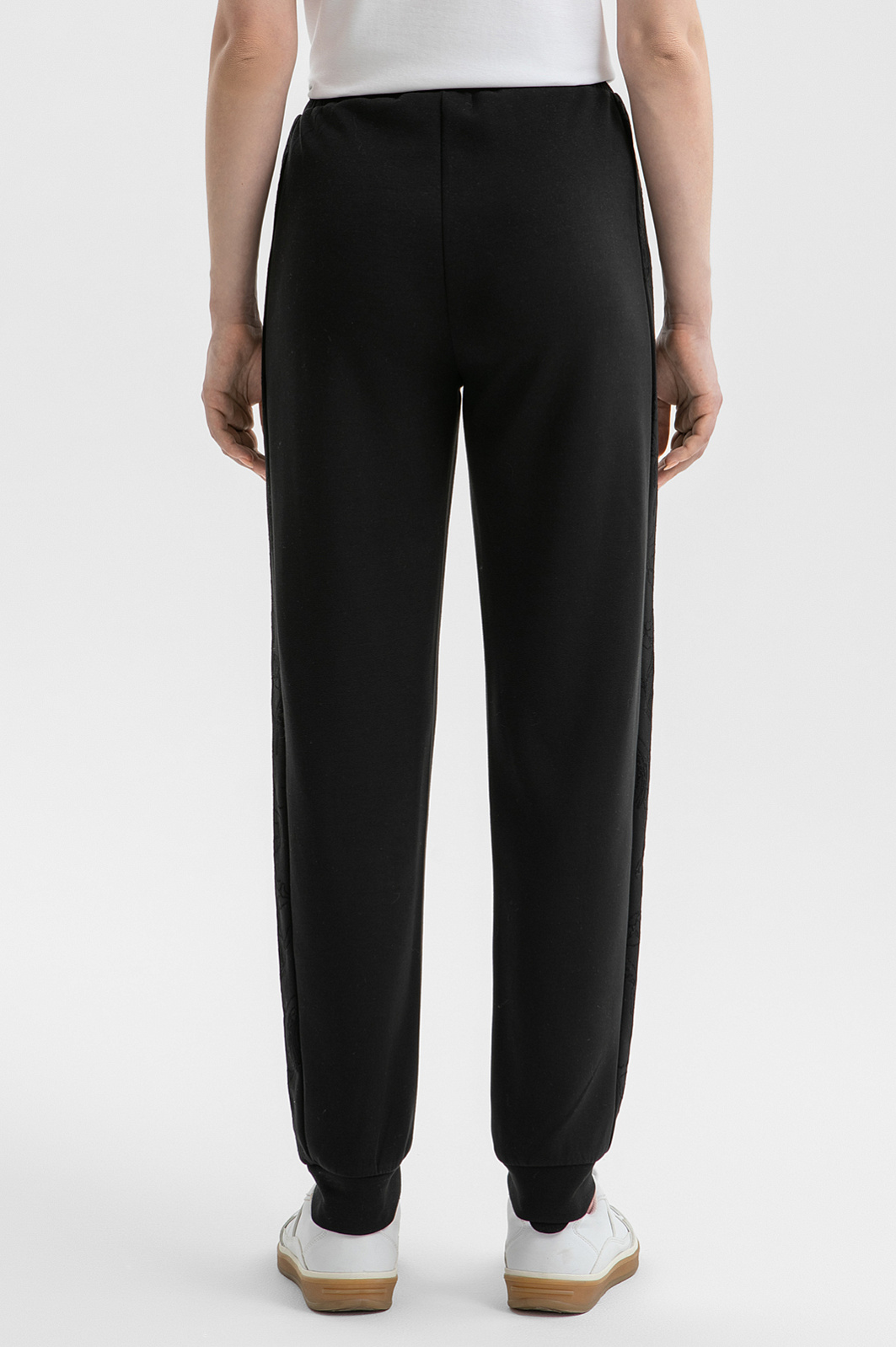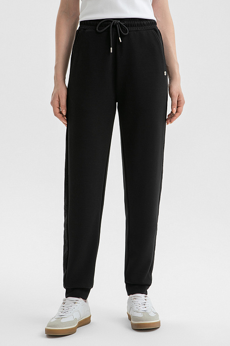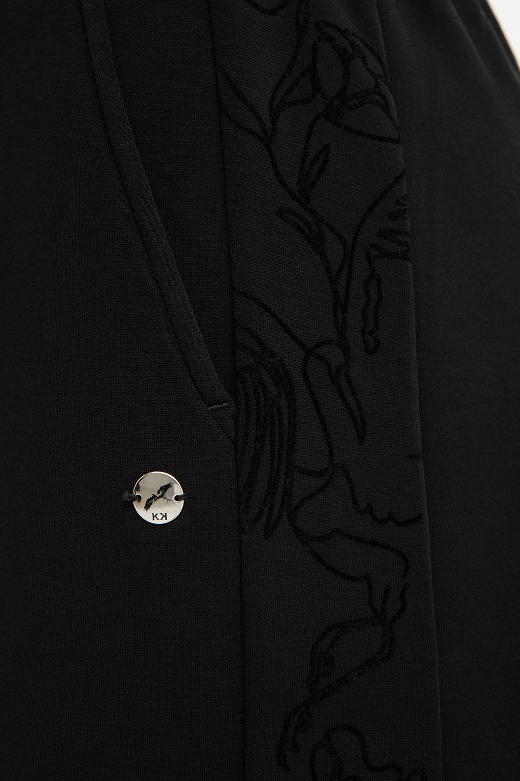 Черные джоггеры KANZLER на кулиске из легкого гладкого трикотажа — удобные универсальные брюки, которые могут стать основой спортивного образа и одеждой для прогулки, похода в спа-салон и небольшого приятного путешествия. Шик и нарядность модели придают детали. Широкие лампасы украшены цветочным контурным узором. Круглый металлический шильдик служит небольшим акцентом и «рифмуется» с металлическими наконечниками шнурка на поясе. Спортивные брюки выполнены из современного дышащего смесового материала. Это произведённый из натурального сырья модал и прочный долговечный полиэстер с добавлением эластичного спандекса.