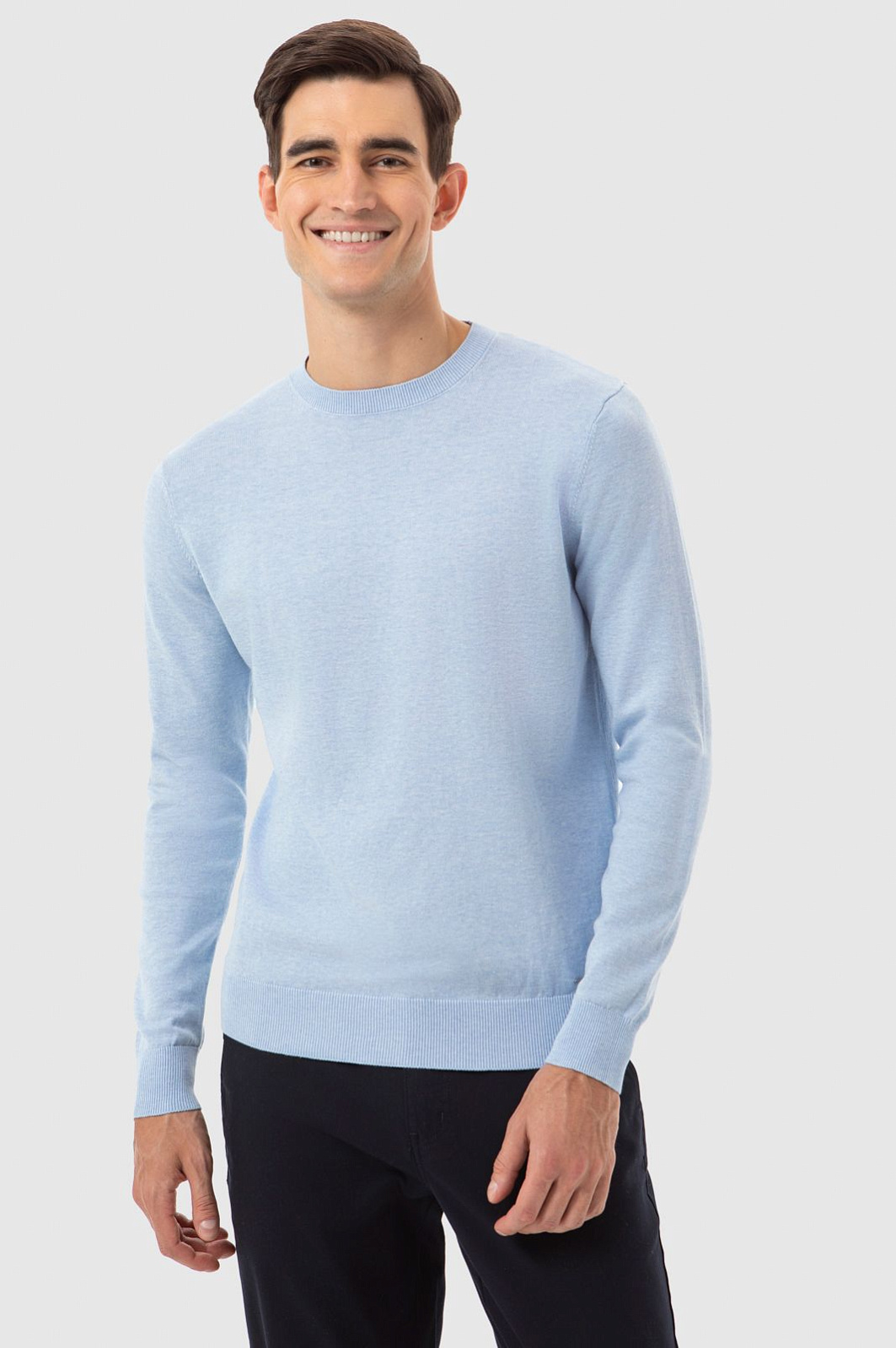 Дизайнеры KANZLER предлагают разбавить базовый гардероб лаконичным светло-голубым джемпером. Пастельный цвет стал очевидным его достоинством, но главный плюс раскрывается в прикосновении. Нежный хлопок Пима премиум-класса поддерживает оптимальную для тела температуру, пропуская при этом воздух. Материал характеризуется лёгкостью, мягкостью, прочностью и долговечностью. Благодаря универсальному круглому вырезу джемпер удобно надевать и снимать. Советуем сочетать его с классическими джинсами или белыми брюками для стильного образа на каждый день. Параметры модели: рост 192, 101-76-97 Размер на модели: M