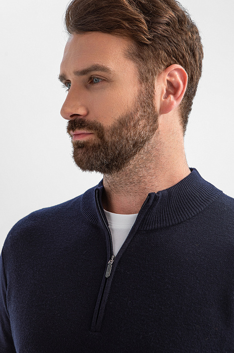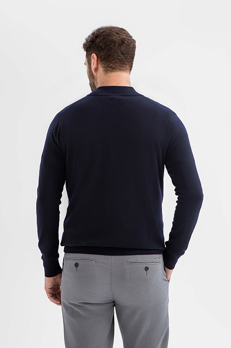 Джемпер KANZLER в глубоком темно-синем оттенке – сочетание натуральных материалов и продуманного дизайна. Состав – проверенная временем формула: шерстяные волокна (95%) обеспечивают идеальную терморегуляцию и сохраняют форму, а добавка кашемира (5%) придает материалу шелковистую фактуру и благородное сияние. Стильный воротник-стойка на молнии позволяет менять образ одним движением руки и регулировать комфортную температуру. Универсальный темно-синий оттенок – основа для множества образов – от деловых встреч до вечерних мероприятий. Модель подходит для создания многослойных сочетаний с футболкой. Параметры модели: рост 189, 102-80-99 Размер на модели: M