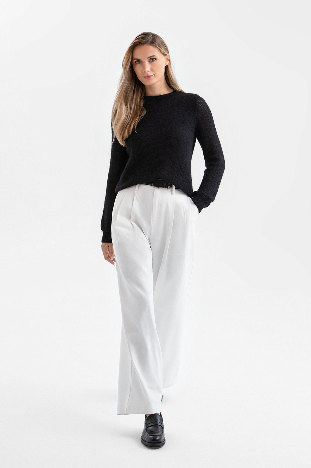Джемпер KANZLER из шелка, мохера и шерсти альпаки — воплощение нежности и женственного стиля. Глубокий чёрный оттенок подчёркивает универсальность модели — она легко впишется как в офисный гардероб, так и в расслабленный вечерний образ. Благодаря лёгкой и воздушной вязке джемпер выглядит изысканно и невесомо. Горловина без выреза делает силуэт лаконичным и элегантным, а трикотажные резинки на поясе и манжетах добавляют аккуратности и обеспечивают комфортную посадку. Тёплый и приятный к телу джемпер станет основой стильных образов в холодное время года. Состав натуральной пряжи — микс нежного шёлка, пушистого мохера и мягкой шерсти альпаки.