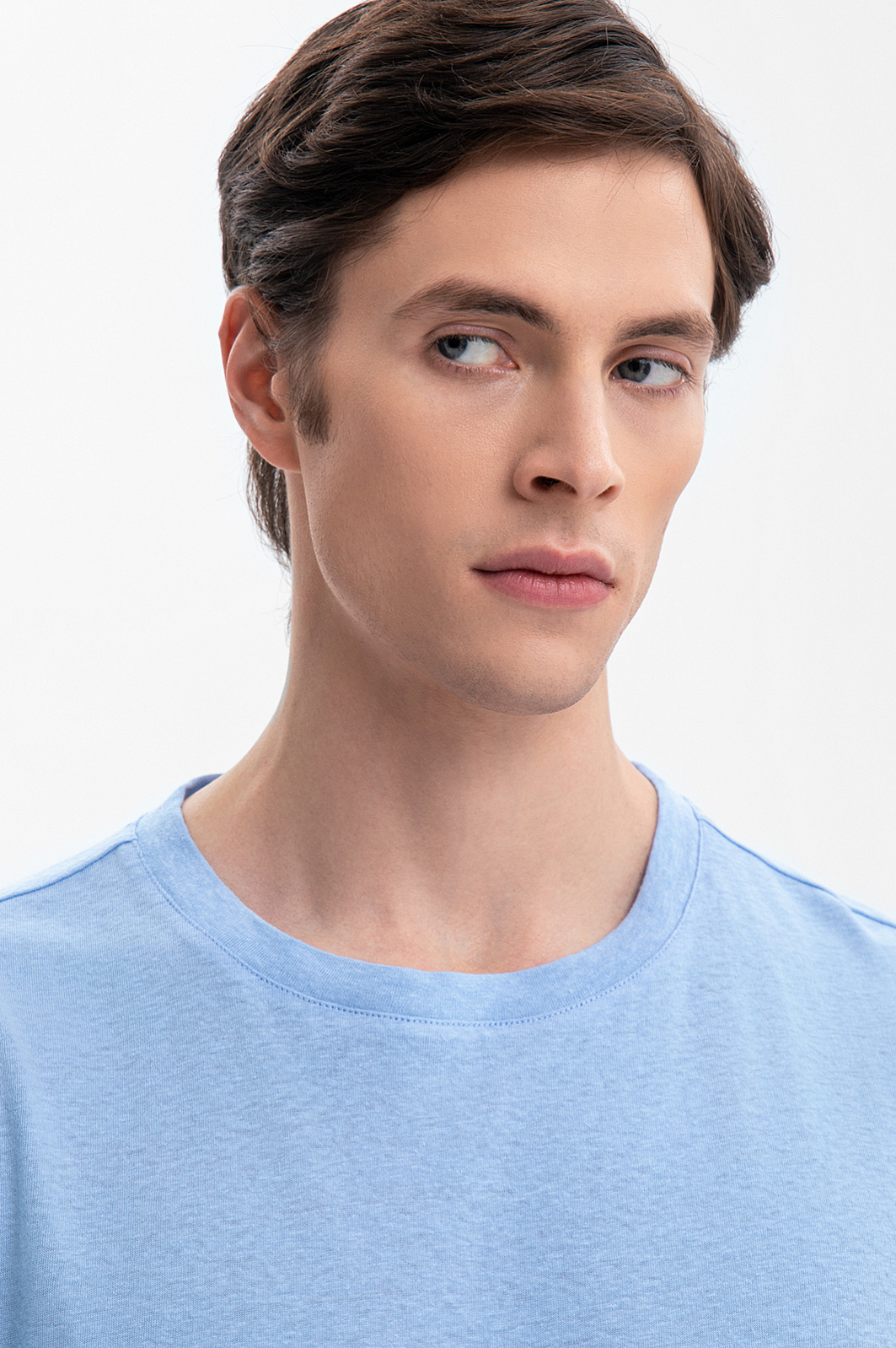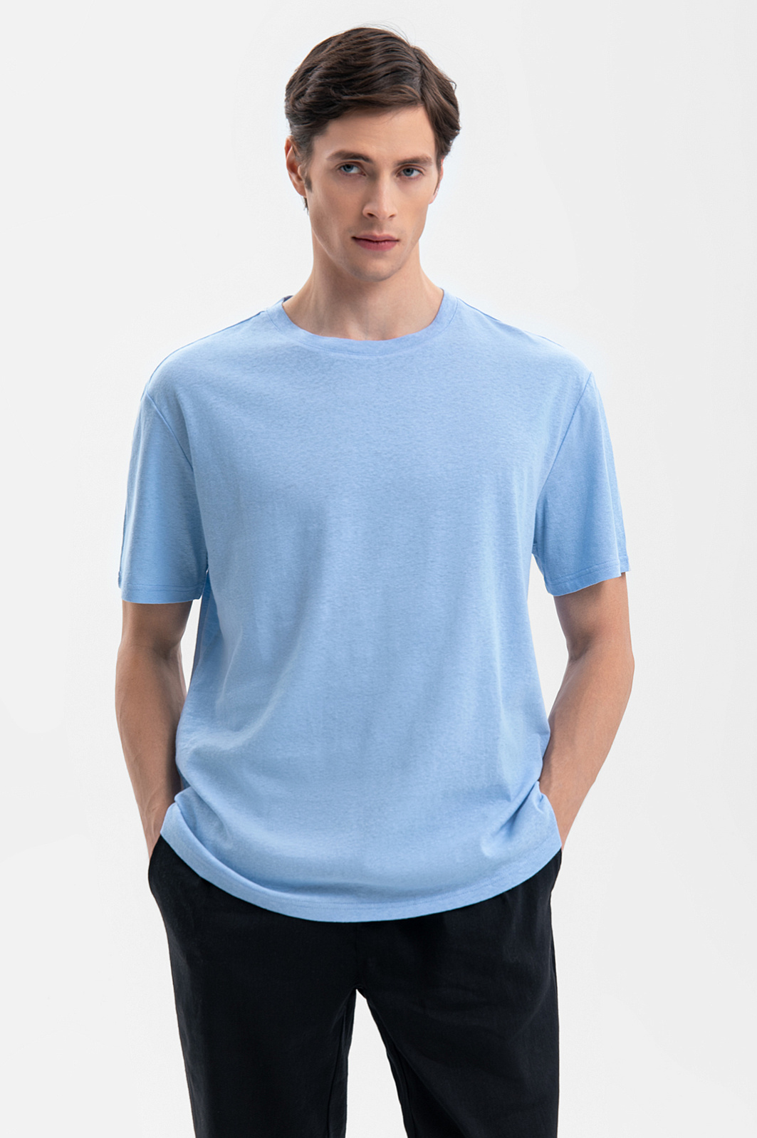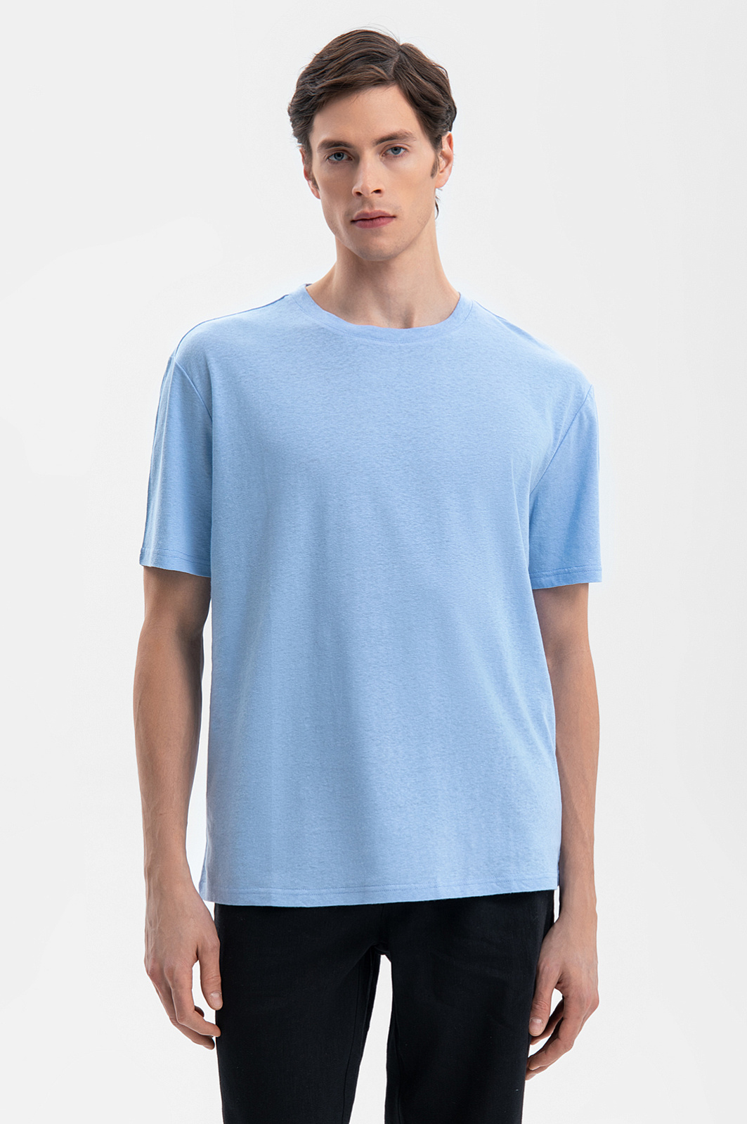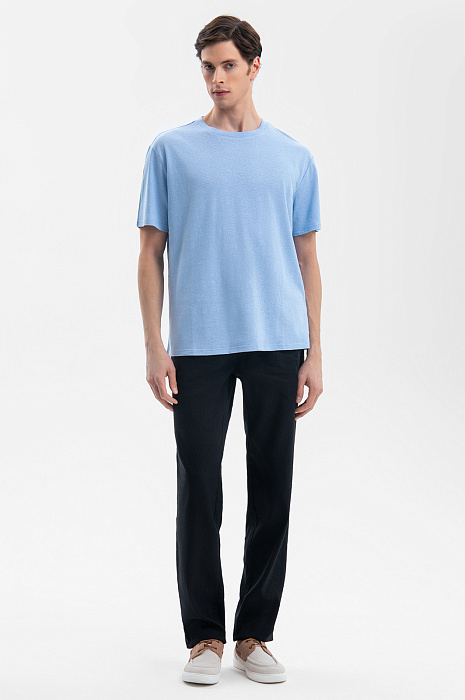 Свободная голубая футболка KANZLER изо льна и хлопка идеальна для активного образа жизни: прогулок, путешествий, работы на свежем воздухе. Легкий и дышащий материал – гарантия комфорта даже в самый жаркий день. Гигроскопичные волокна льна быстро впитывают влагу и охлаждают кожу, а хлопок придает материалу мягкость. Свободный крой объединяет комфорт и безупречный стиль: свободный силуэт мягко обволакивает тело, не стесняя движений. Натуральная фактура льна придает образу ненавязчивый богемный шарм. Дополните футболку бежевыми брюками, песочными бермудами или темными льняными брюками. Параметры модели: рост 189, 91-78-95 Размер на модели: М