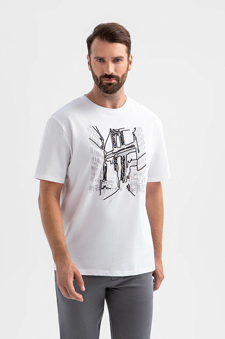 Белая футболка KANZLER создана для ценителей урбанистической эстетики. Черно-серый принт на груди изображает мегаполис с его динамичным ритмом. Модель выполнена из 100-процентного хлопка, мягкого и гипоаллергенного материала, который обеспечивает идеальный воздухообмен, отводит влагу и сохраняет форму после многократных стирок. Свободный крой дарит максимальную свободу движений. Сочетайте модель с карго, брюками или денимом. Параметры модели: рост 189, 102-80-99 Размер на модели: M