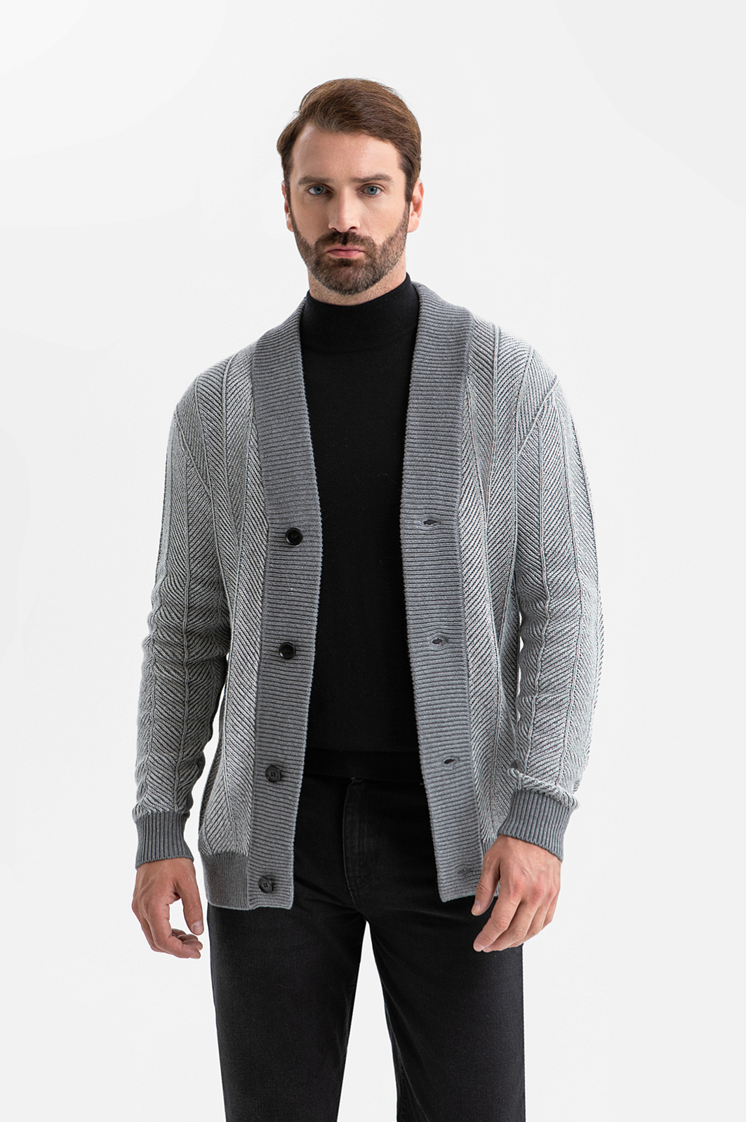 Серый кардиган KANZLER из хлопка и кашемира — воплощение комфорта и элегантности. Базовый элемент гардероба мужчины, который ценит качество, стиль и функциональность. Переднюю часть украшает рисунок, образованный диагональным рубчиком и чёткими вертикальными линиями, которые визуально вытягивают силуэт. Такой архитектурный дизайн подчёркивает строгость и аккуратность модели, делая её уместной как в деловом, так и в повседневном стилях. Более светлый оттенок передней части гармонично сочетается со спинкой и резинками среднего серого тона, создавая мягкий контраст. Треугольный вырез хорошо сочетается с рубашкой, футболкой и водолазкой. Вязаный трикотаж из натуральных волокон приятен к телу, мягко облегает тело и обеспечивает комфорт в течение дня. Кашемир придаёт ткани изысканный вид и нежность, а хлопок — прочность, воздухопроницаемость и практичность. Параметры модели: рост 189, 102-80-99 Размер на модели: M