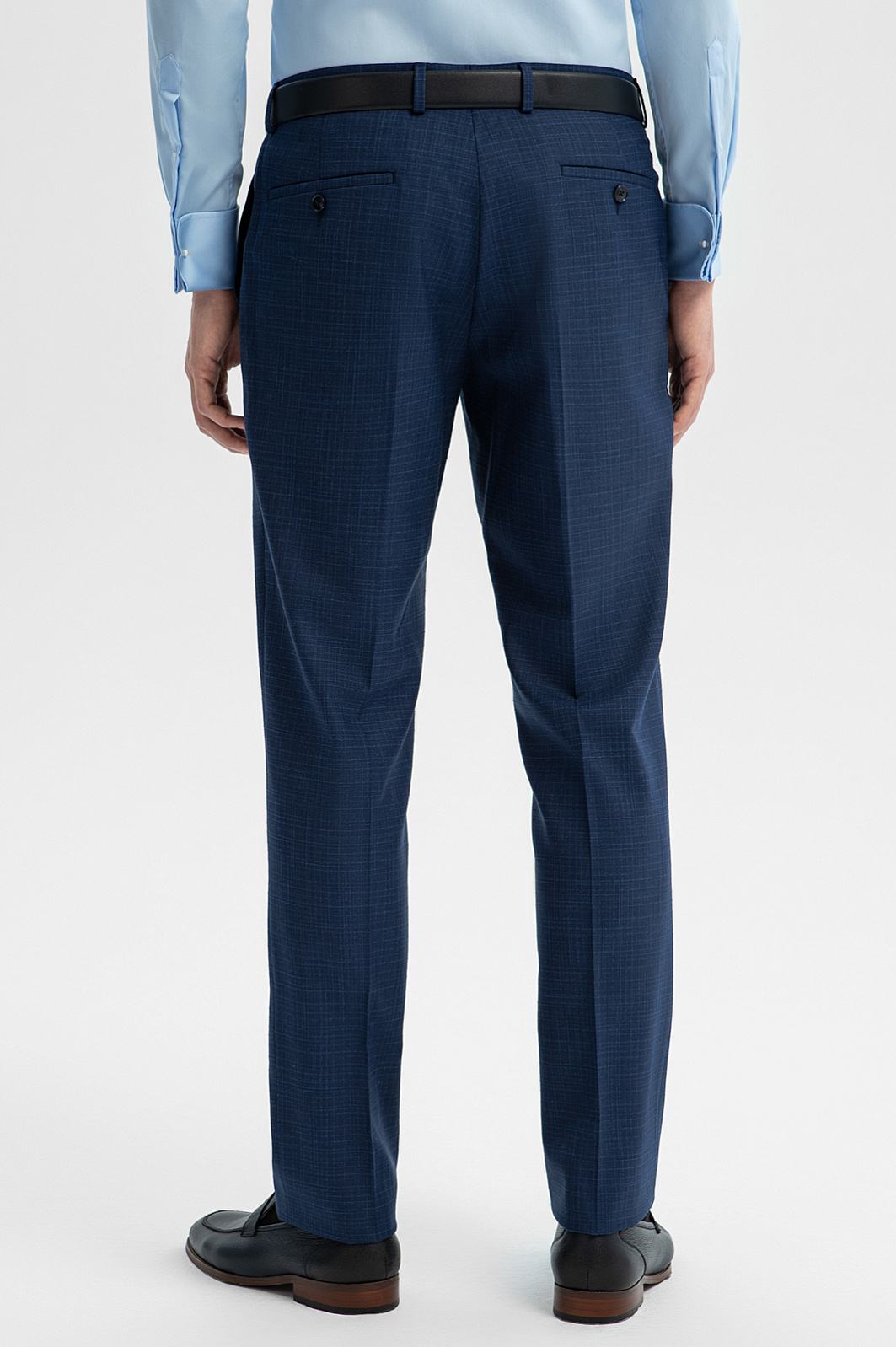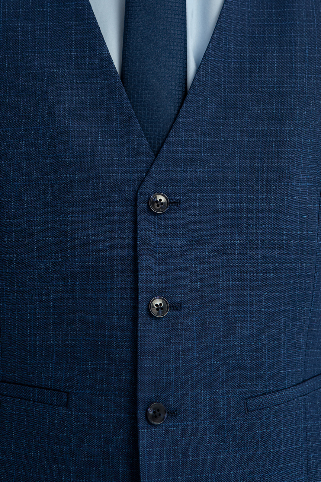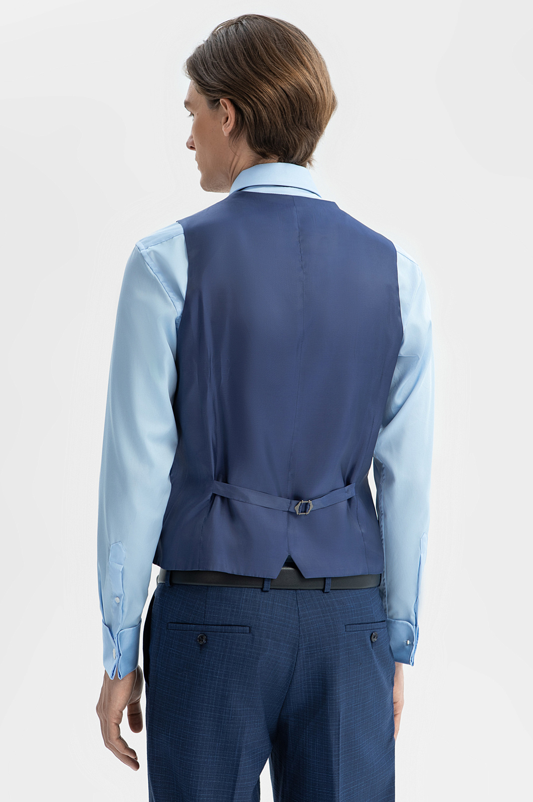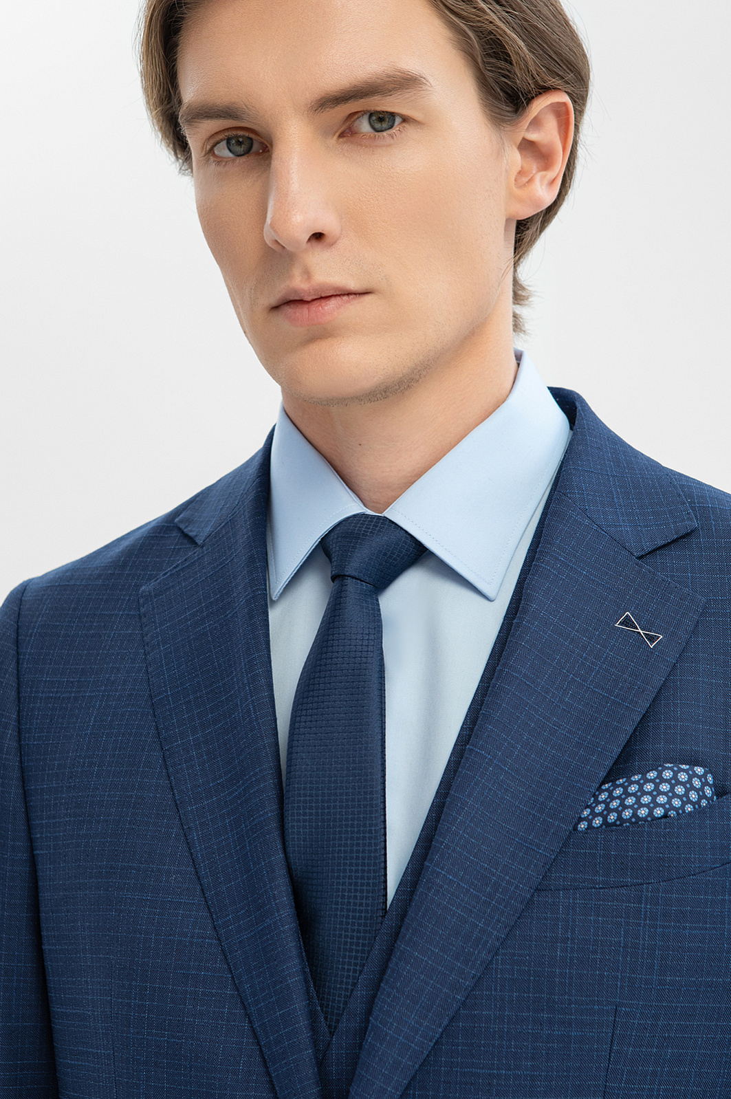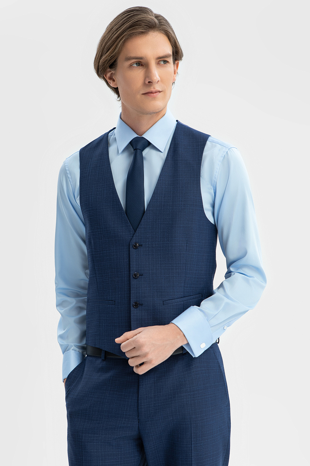 Изысканный костюм-тройка KANZLER синего цвета из дорогой натуральной ткани с водоотталкивающей обработкой идеально подойдет эффективному руководителю, эксперту и профессионалу. Он составлен из однобортного пиджака с двумя шлицами сзади, брюк со стрелками и жилета, которые сшиты из смесовой ткани с полотняным переплетением. В составе материала — тонкая сертифицированная шерсть мериноса Супер 120S (90%) с добавлением гипоаллергенных волокон хлопка и льна, которые улучшают воздухопроницаемость. Водоотталкивающая обработка защищает костюм от загрязнений и намокания и сохраняет аккуратный вид в любых погодных условиях.