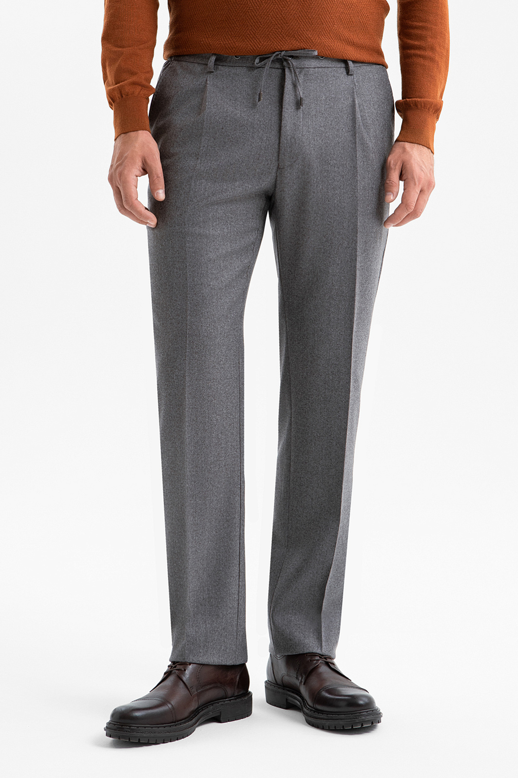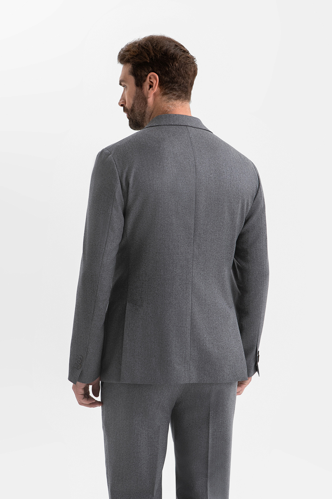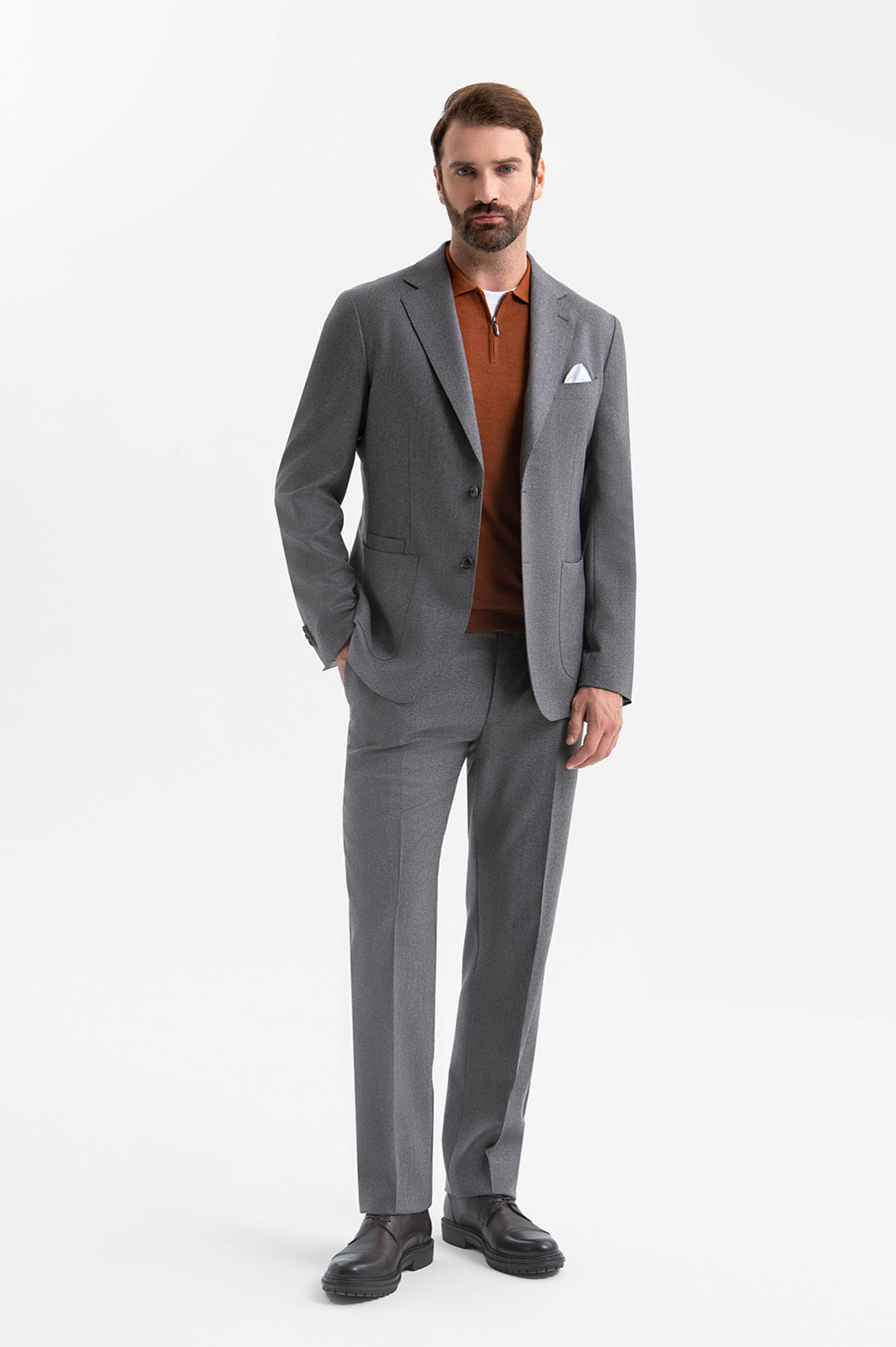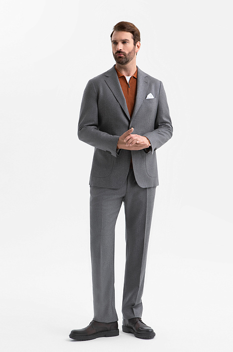 Элегантный костюм-двойка KANZLER спокойного серого цвета выполнен из дорогой высококачественной шерсти мериноса, которая обеспечивает комфорт, функциональность и современную эстетику. Прилегающий силуэт костюма мягко очерчивает контуры тела, создавая динамичный образ. Пара составлена из пиджака с накладными карманами и удобных брюк на кулиске со стрелками. Премиальная шерсть Супер 120S создана с применением передовых технологий: водоотталкивающая обработка защищает материал от переменчивой погоды. Его тончайшие ворсинки толщиной не более 18 микрон сохраняют естественное тепло и поддерживают оптимальную температуру тела.