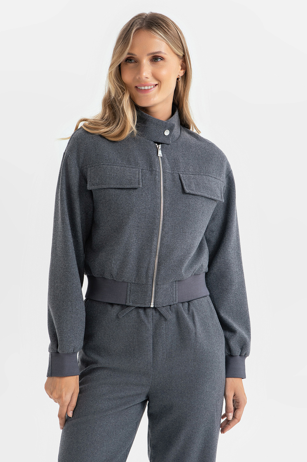 Укороченный жакет-бомбер и брюки от KANZLER создадут безупречный динамичный облик. Глубокий антрацитовый оттенок и минималистичный крой придают костюму премиальную лаконичность. Жакет дополнен накладными карманами и воротником-стойкой с кнопкой. Посадка брюк регулируется благодаря поясу на кулиске. Смесовый материал из шерсти полиэстером обеспечивают тепло и прочность, даря ощущение комфорта. Этот ансамбль – стильное решение для офиса, встреч с друзьями и прогулок, создающее динамичный и уверенный образ.