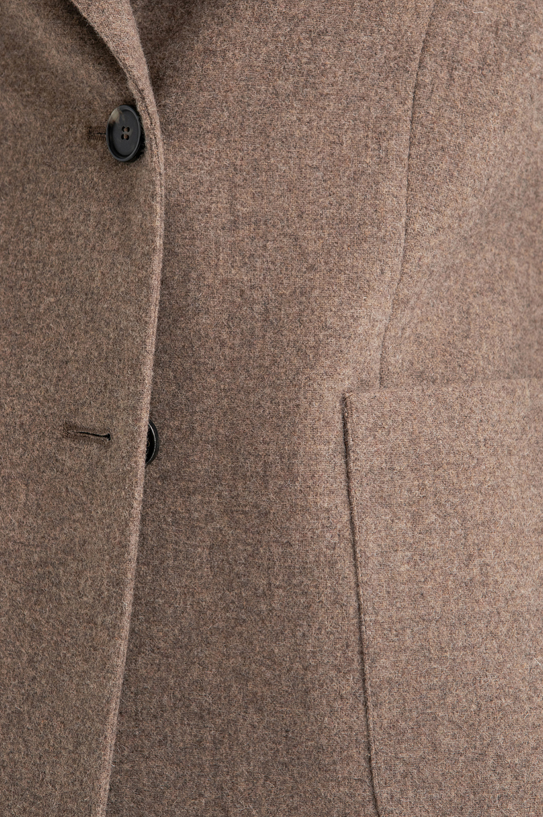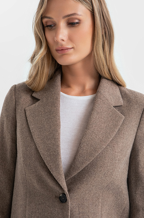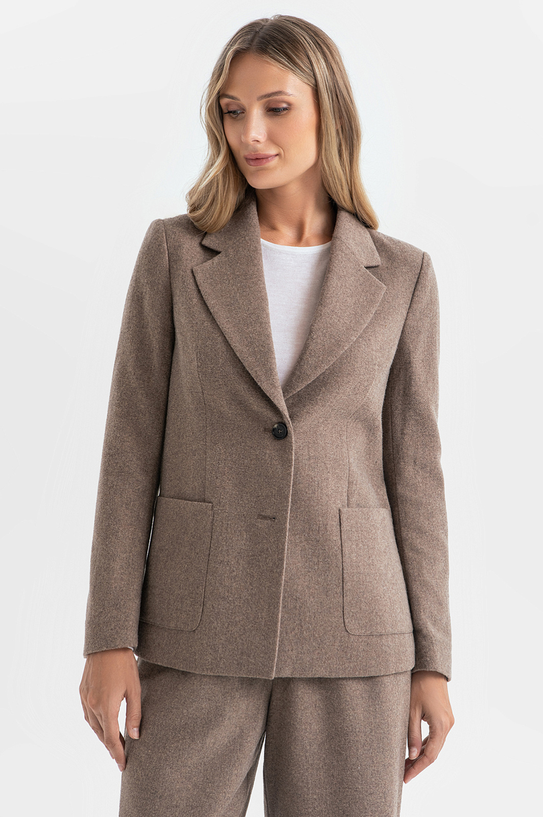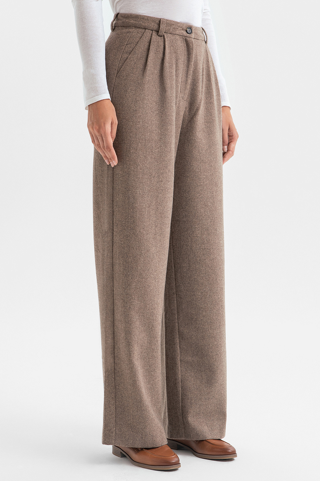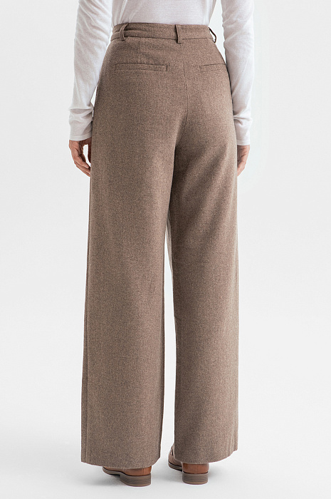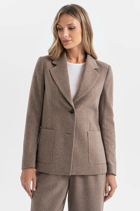 Элегантный дуэт: пиджак и брюки-палаццо в светло-коричневых тонах. Для создания костюма дизайнеры KANZLER выбрали смесовый шерстяной материал премиального качества, устойчивый к износу. Ткань приятно ощущается на коже, обеспечивая комфорт на протяжении всего дня. Лаконичный крой пиджака дополняют брюки с защипами на талии, создавая элегантный и легкий силуэт. Создайте цельный образ, дополнив костюм светлым джемпером и аксессуарами из натуральной кожи, чтобы быть на высоте весь день – от рабочего утра до вечернего мероприятия.