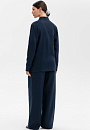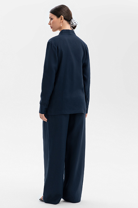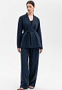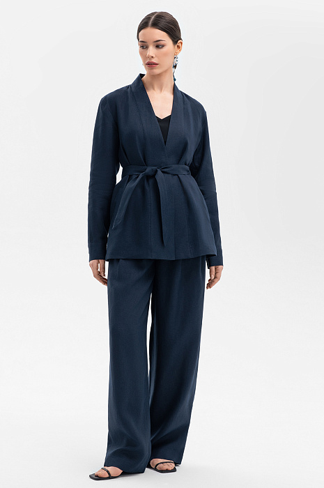 Темно-синий брючный костюм KANZLER изо льна, заданный сдержанными чистыми линиями, выглядит роскошно и расслабленно. Он идеально подойдет для теплых летних дней и межсезонья. Жакет с запахом и небольшими разрезами по бокам можно носить с поясом. Его лаконичный крой напоминает кимоно. Рукава в рубашечном стиле добавляют изысканной простоте спокойную практичность. Брюки A-образного силуэта с высокой талией и мягкими защипами имеют плавные женственные очертания. Дорогая натуральная ткань из 100-процентного льна практически не нагревается в жаркие дни — гипоаллергенные волокна обеспечивают циркуляцию воздуха и отводят влагу, поддерживая свежесть тела.