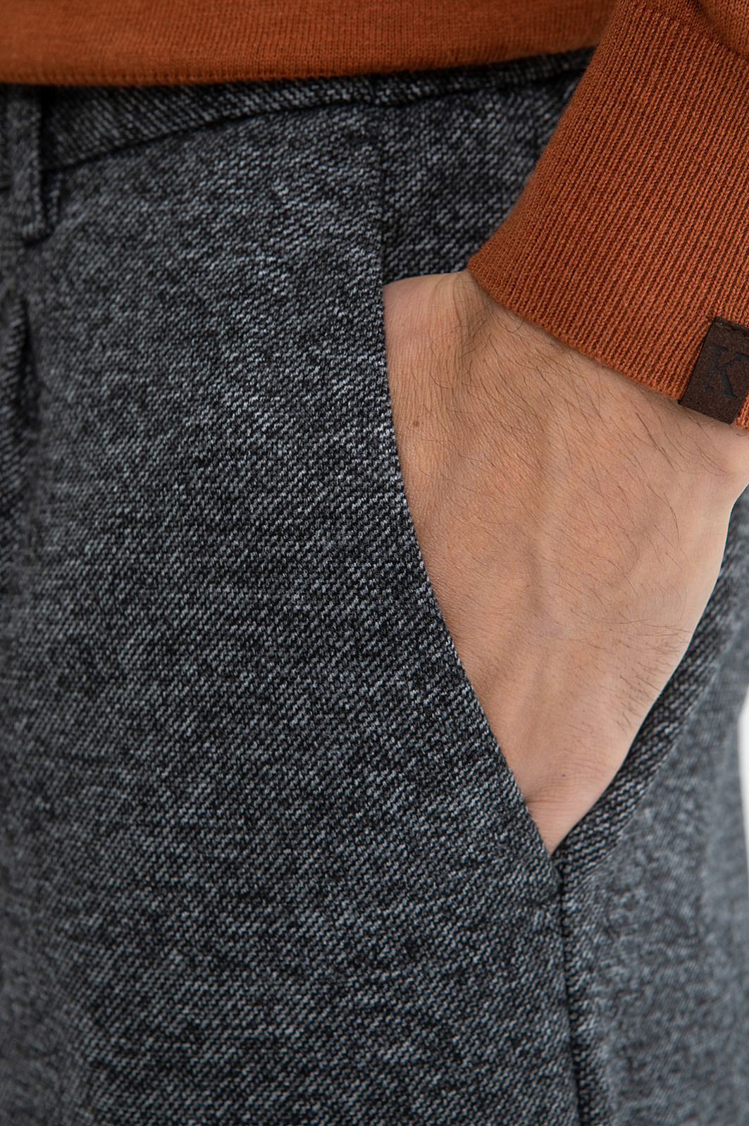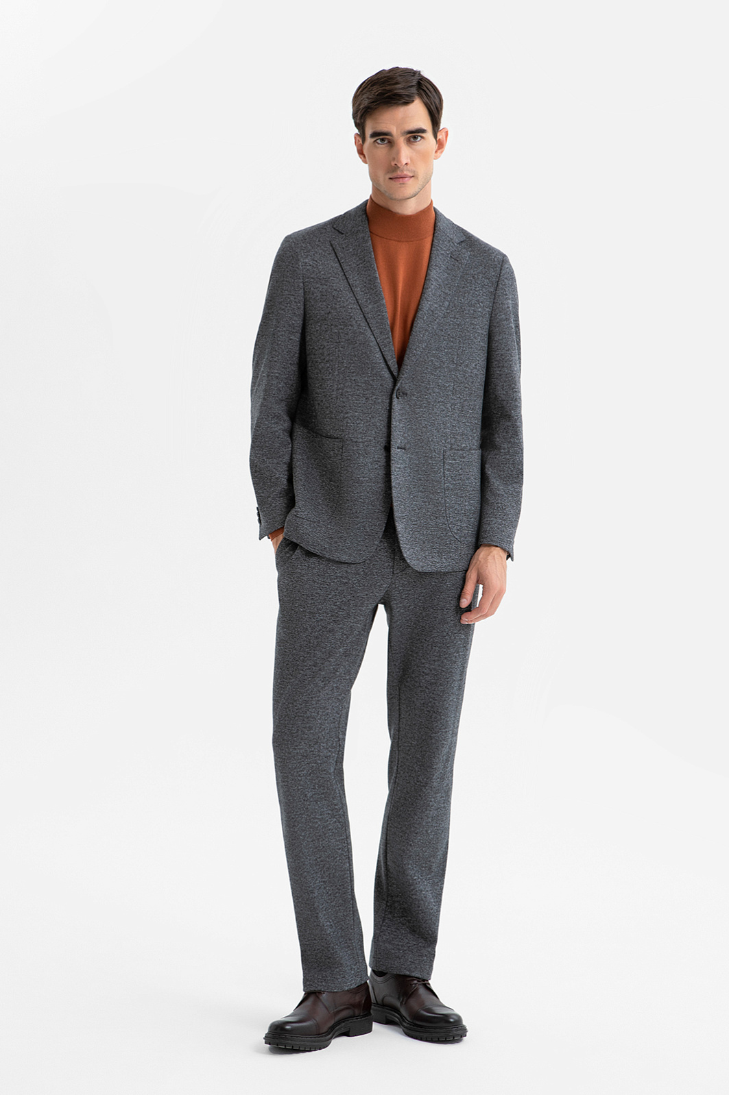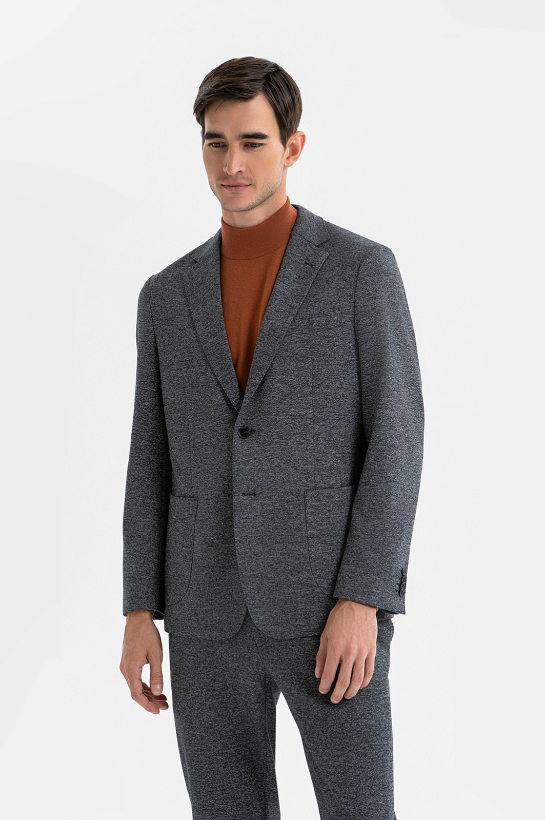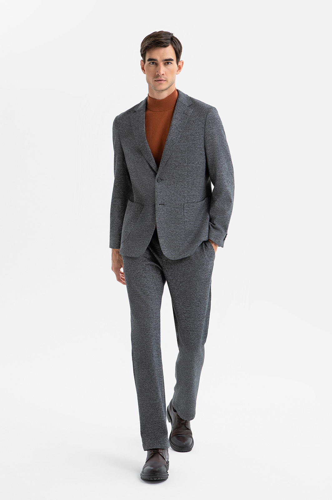 Костюм-двойка KANZLER из серой смесовой ткани с эффектом меланжа — современная классика без лишней строгости. Удобная повседневная модель составлена из однобортного слегка приталенного пиджака с естественной линией плеча и слегка зауженных брюк с кулиской и легкими защипами, которые обеспечивают комфортную посадку для любой комплекции. Материал пиджака — современная технологичная смесовая ткань в плотный диагональный рубчик. Состав из прочного полиэстера и дышащего района с добавлением эластичного спандекса делает её комфортной, лёгкой в уходе и готовой к любым испытаниям долгого дня в офисе.