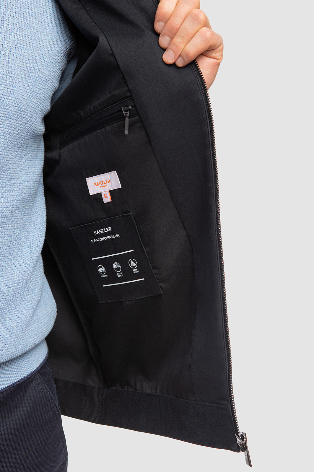 Стильный темно-синий бомбер KANZLER — союз элегантного минимализма, практичности и комфорта. Такая куртка отлично впишется в гардероб любителей спортивного стиля и активного образа жизни. Небольшие детали — застежка-кнопка на воротнике, язычки на молниях из белого металла, а также неброский фирменный инициал на груди — придают модели шика. Застежки сзади, внизу, и на манжетах служат для регулирования прилегания краев куртки. Современная прочная ткань из полиэстера с небольшим добавлением спандекса отлично держит форму, не мнется и устойчива к капризам погоды. Подкладка из практичного смесового материала (полиэстер и хлопок) обеспечивает комфорт и воздухообмен. Параметры модели: рост 187, 108-88-104 Размер на модели: 52