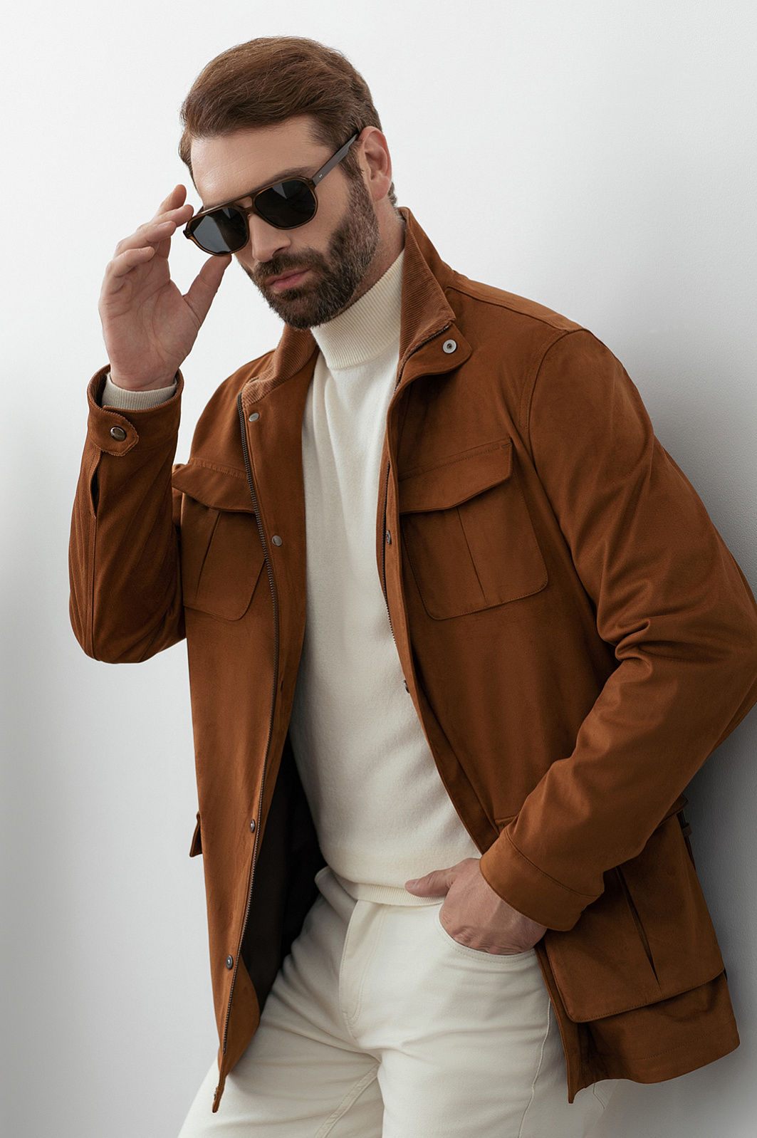 Куртка KANZLER из алькантары красивого оттенка мокко — современная версия куртки-сафари, которая приобрела культовый статус. Модель сохранила характерные черты: четыре больших накладных кармана, пояс-ремень и воротник-стойку. У куртки слегка прилегающий силуэт, вельветовая вставка на воротнике и удобная застежка-молния, скрытая под планкой с кнопками. Материал верха — алькантара. Мягкая, бархатистая ткань не лоснится, не протирается и годами сохраняет первоначальный вид и форму. Параметры модели: рост 189, 102-80-99 Размер на модели: 50