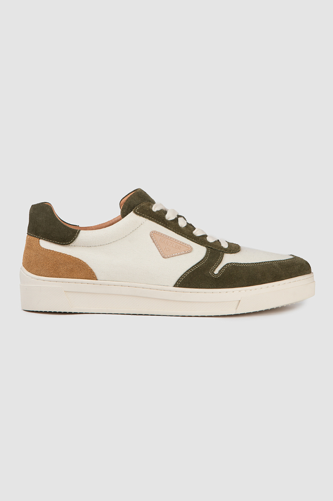 Белые стильные кеды KANZLER из практичного прочного текстиля украшены деталями из натуральной замши темно-оливкового и песочного оттенков и небольшим треугольником фирменной нашивки. В результате получился шедевр спортивной моды и современного урбанистического стиля. Подкладка и стелька из натуральной кожи обеспечивают воздухопроницаемость и комфорт. Утолщенная подошва из качественной плотной резины не стирается даже при длительной и повседневной ходьбе, обеспечивает устойчивость и уверенность при движении. В невероятно удобных кедах KANZLER можно не только легко пройти рекомендуемую дневную норму в 10 тысяч шагов, но и удвоить дистанцию.