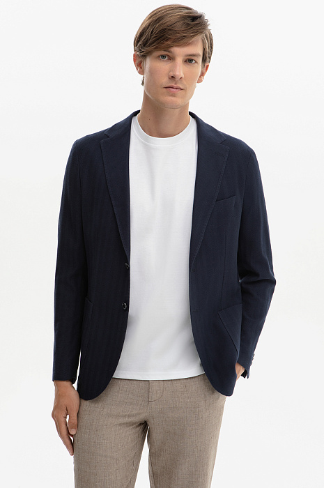 В лимитированную коллекцию KANZLER вошел пиджак в глубоком синем оттенке – воплощение лаконичной элегантности в каждой детали. Особое внимание привлекает изысканный узор «шеврон», создающий динамичную и визуально интересную фактуру. Смесовый материал премиального качества сочетает в себе шелковистость и мягкость вискозы, прочность полиэстера, воздухопроницаемость и гигроскопичность хлопка. Ткань приятна на ощупь, комфортно ощущается на теле и сохраняет форму и первозданный вид во время длительного ношения. Небольшое добавление эластана обеспечивает свободу движения и отличную посадку, адаптируясь к особенностям фигуры. Приталенный крой создает собранный, аккуратный силуэт, а двойная шлица обеспечивает дополнительный комфорт. Элегантный пиджак станет надежным спутником как на деловых встречах, так и на вечерних мероприятиях. Параметры модели: рост 191, 97-77-99 Размер на модели: 50