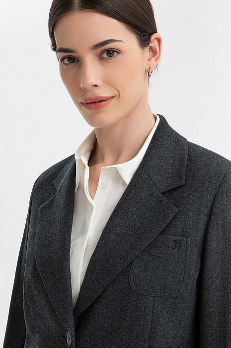 Тёмно-серый пиджак KANZLER из благородной шерсти сочетает строгий элегантный стиль и непринужденность. Модель украшена вышитым фирменным инициалом в тон. Классический крой с широким воротником, лацканами и шлицей сзади дополнен современными деталями — аккуратными накладными карманами и небольшими разрезами на рукавах. Вытачки спереди создают привлекательный женственный силуэт. Ткань из 100-процентной шерсти приятна на ощупь и при этом достаточно структурирована, чтобы поддерживать форму. Это тонкие натуральные волокна, которые хорошо сохраняют естественное тепло тела, не допуская перегревания. Гладкая прочная подкладка сделана из прочного воздухопроницаемого смесового материала (полиэстер и вискоза).