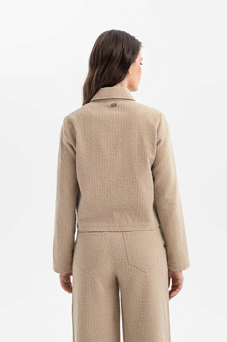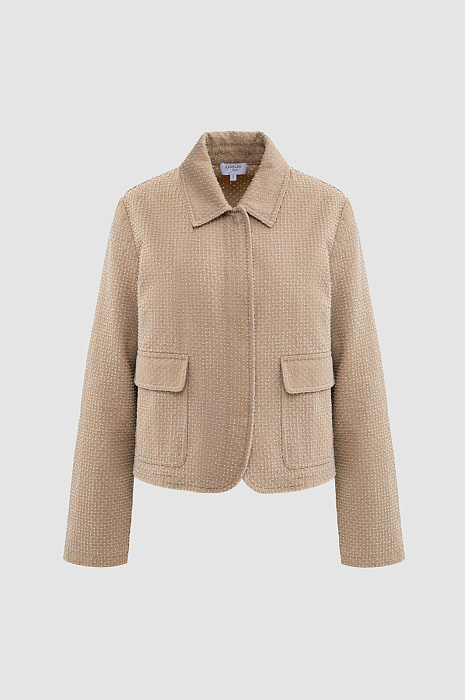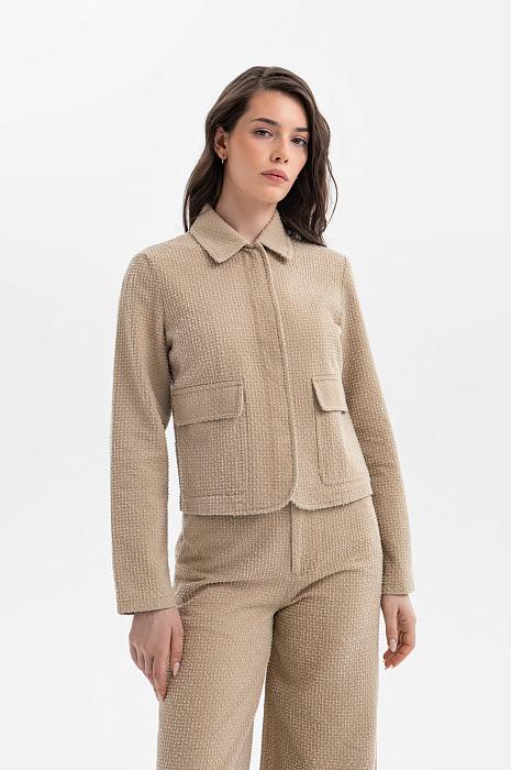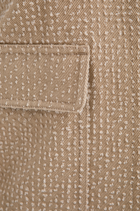 Современный пиджак KANZLER тёплого карамельного оттенка задаёт новые стандарты городской элегантности. Он выглядит свежо и гармонично, придавая образу лёгкость и непринуждённый шик. Модель сочетает пиджачный крой с элементами бомбера. Минималистичный дизайн подчёркнут деталями: планкой и накладными карманами с клапанами. Особое внимание привлекает ткань. Белый ворс создаёт выразительный текстурный узор, который придаёт модели особый шарм и приятную тактильность. В составе материала — чистый гипоаллергенный хлопок, который обеспечивает бескомпромиссный комфорт даже в жаркие дни. Саржевое плетение формирует плотную диагональную структуру, благодаря которой ткань хорошо держит форму и сохраняет аккуратный внешний вид.