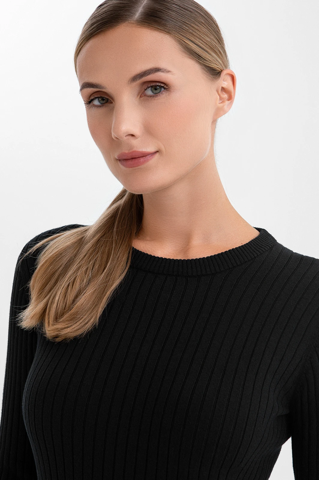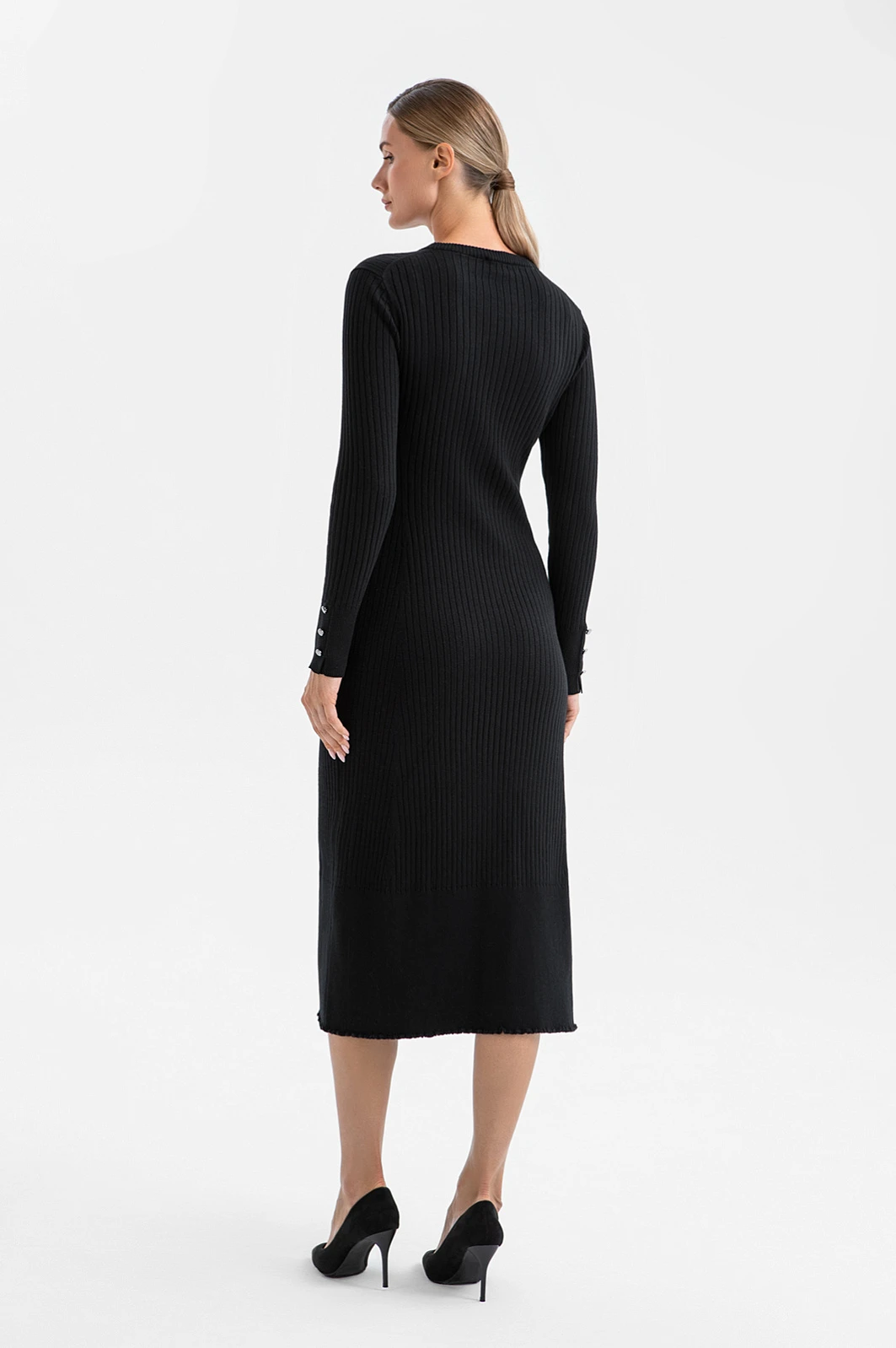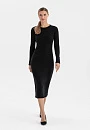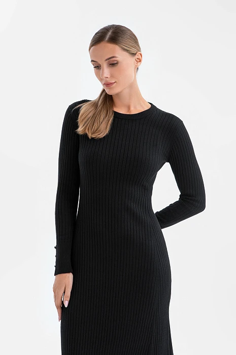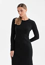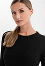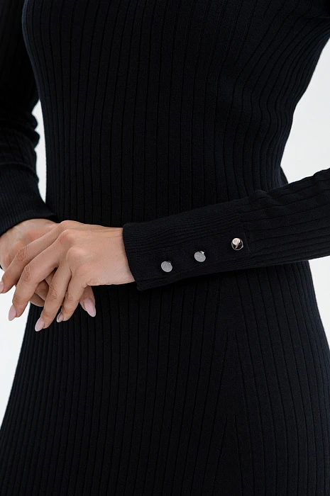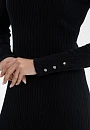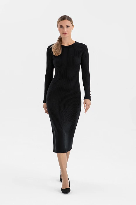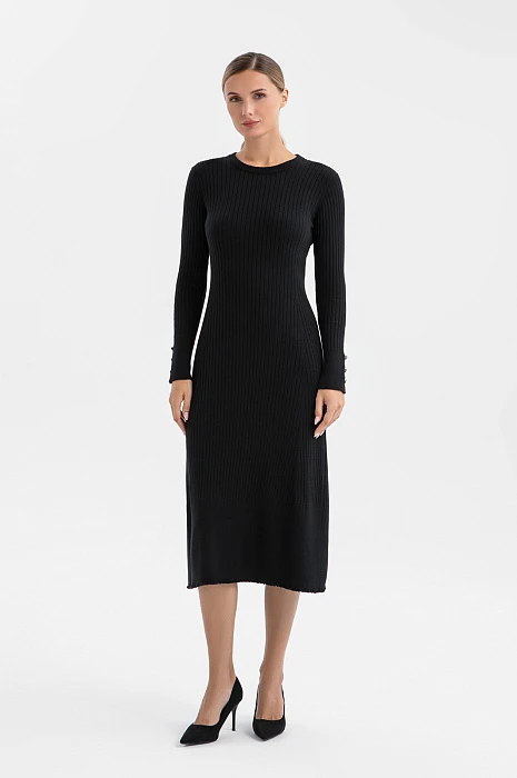 Чёрное платье KANZLER с длинным рукавом из хлопка с кашемиром делает образ привлекательным и неотразимым, оставаясь при этом сдержанным и стильным. Эластичная фактурная ткань в широкий рубчик мягко повторяет контуры тела, подчеркивая женственность фигуры. Аккуратный закруглённый вырез горловины и длина чуть ниже колена делают модель универсальной и элегантной, а блестящие металлические пуговицы на манжетах служат роскошным, привлекающим внимание акцентом. Микс хлопка и кашемира объединяет в себе лучшие качества этих натуральных гипоаллергенных волокон: хлопок обеспечивает воздухопроницаемость, мягкость и комфорт, а кашемир дарит нежность, лёгкость и тепло.