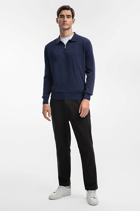 Поло KANZLER из лимитированной коллекции красивого чернильно-синего оттенка объединяет роскошь и комфорт. Приятный трикотаж-джерси (союз благородных натуральных волокон хлопка, шелка и льна) мягко облегает тело, обеспечивая непревзойденный комфорт. Модель украшена небольшой вышитой эмблемой. Нотку спортивного шика привносит застежка-молния с аккуратным язычком из белого металла. Дорогой смесовой материал обладает уникальными достоинствами входящих в его состав волокон. Хлопок обеспечивает воздухообмен и оптимальную для тела температуру, шелк — легкий блеск и ощущение нежного прикосновения, лен — гигроскопичность и устойчивость к загрязнениям. Параметры модели: рост 192, 101-76-97 Размер на модели: M