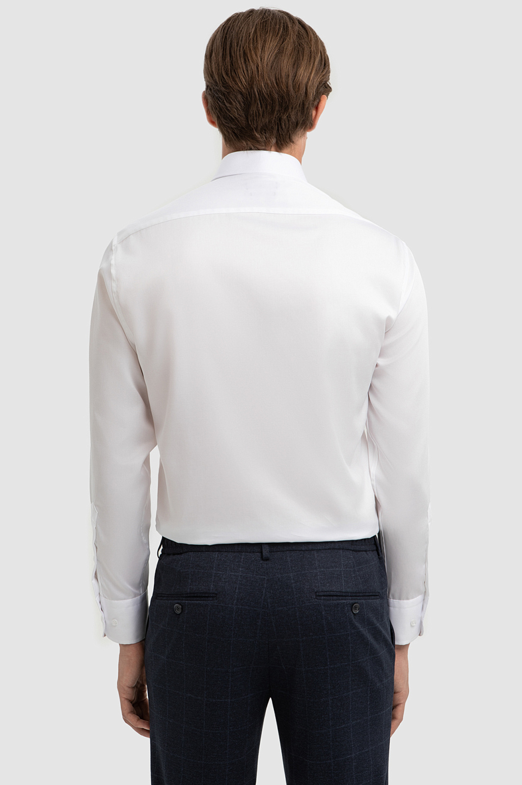 Для пошива классической белоснежной сорочки использовали мягкую хлопковую ткань, не уступающую по гладкости шелку. Фасон Regular fit оптимально подходит для большинства типов фигур, обеспечивая удобную и комфортную посадку. Гладкая ткань с матовым финишем отлично пропускает воздух. Натуральный материал сохраняет ощущение свежести в течение всего дня, белоснежный цвет воплощает чистоту и элегантность, придавая вашему образу безупречный вид. Наши стилисты рекомендуют сочетать эту модель с костюмными брюками, дополнив образ стильными лоферами. Рубашка KANZLER с отложным воротником и длинными рукавами будет уместна в офисе, на официальных мероприятиях и деловых встречах. Классический крой и универсальный цвет идеально подходит для создания строгого делового образа.