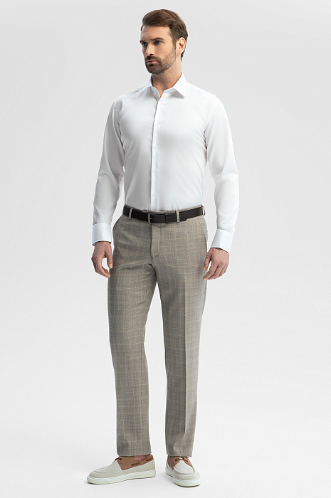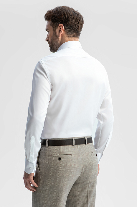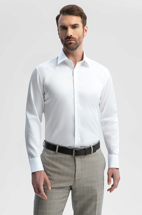 Белая приталенная сорочка KANZLER, строгая и лаконичная, без контрастных акцентов, станет универсальным решением для офисного гардероба. Модель идеально подстраивается под классические костюмы любой цветовой гаммы, дополнит образы с кардиганом и джемпером. Для пошива модели с воротником кент дизайнеры использовали мягкий, тонкий хлопок. Приталенный крой продуман так, чтобы изделие подчеркивало фигуру, не собираясь в складки под пиджаком. Главная особенность и важное достоинство модели - уникальная технология обработки ткани Non iron – такая рубашки практически не мнется в течение дня, их легко гладить после стирки и повесить на плечики высыхать. Рубашка с этой технологией особенно любима мужчинами, которые работают в офисе и бизнес - среде. Модель из 100% натурального длинноволокнистого хлопка подарит комфорт и подчеркнет строгий стиль.