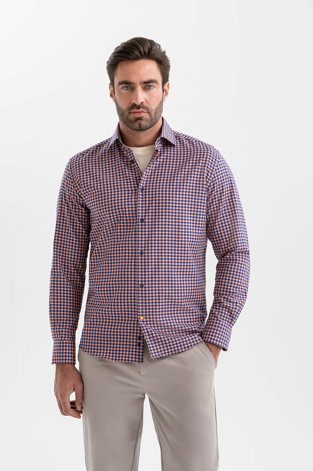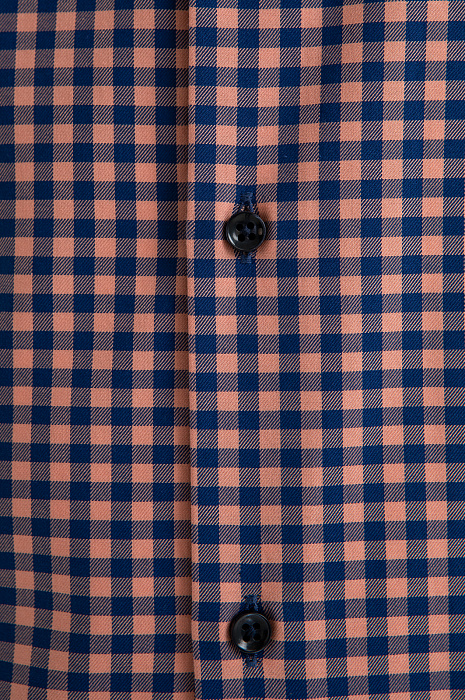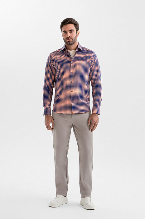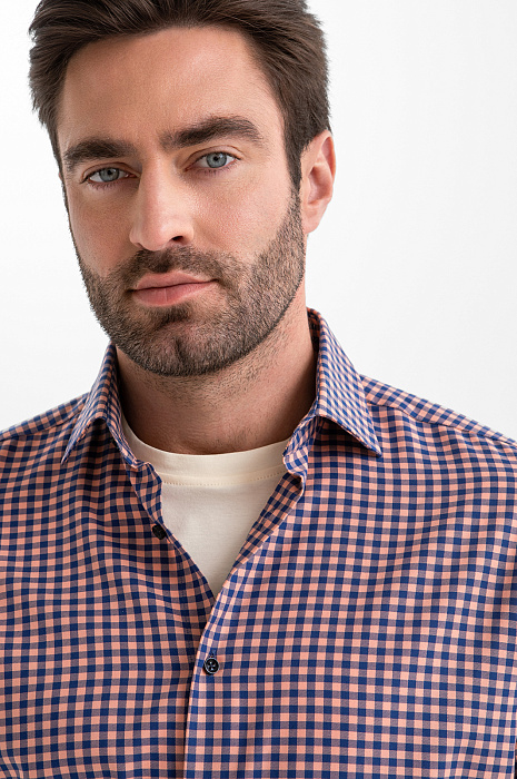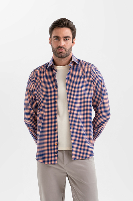 Сорочка KANZLER из хлопка с клетчатым узором, заданным оранжевыми и синими полосами, создает оптимистичное настроение. Такая модель уместна в креативном офисе и на отдыхе — там, где хочется выглядеть ярко и стильно. Для создания непринуждённых многослойных образов её можно носить нараспашку, надев с футболкой или майкой. Свободный прямой крой не ограничивает движения и обеспечивает естественную посадку. Приятная к телу ткань из чистого хлопка спасает от перегревания в жаркие дни. Натуральные гипоаллергенные волокна хорошо пропускают воздух, защищают кожу от избыточного ультрафиолета и поддерживают комфортную температуру.