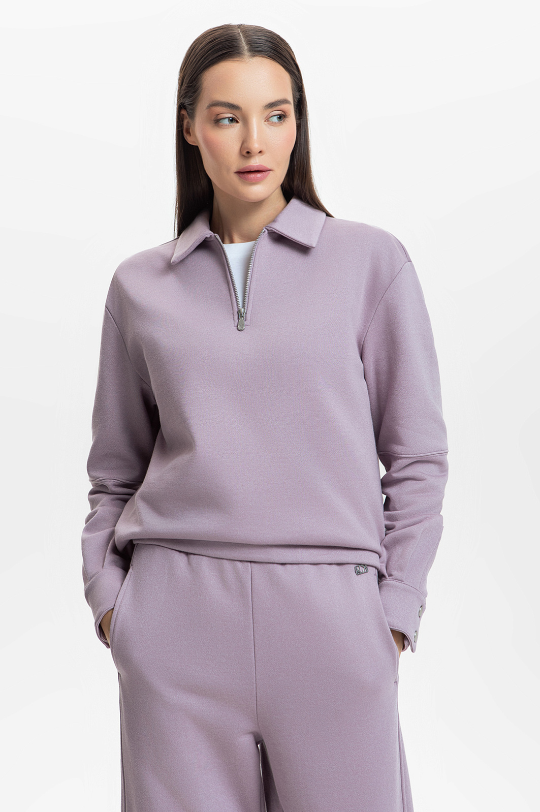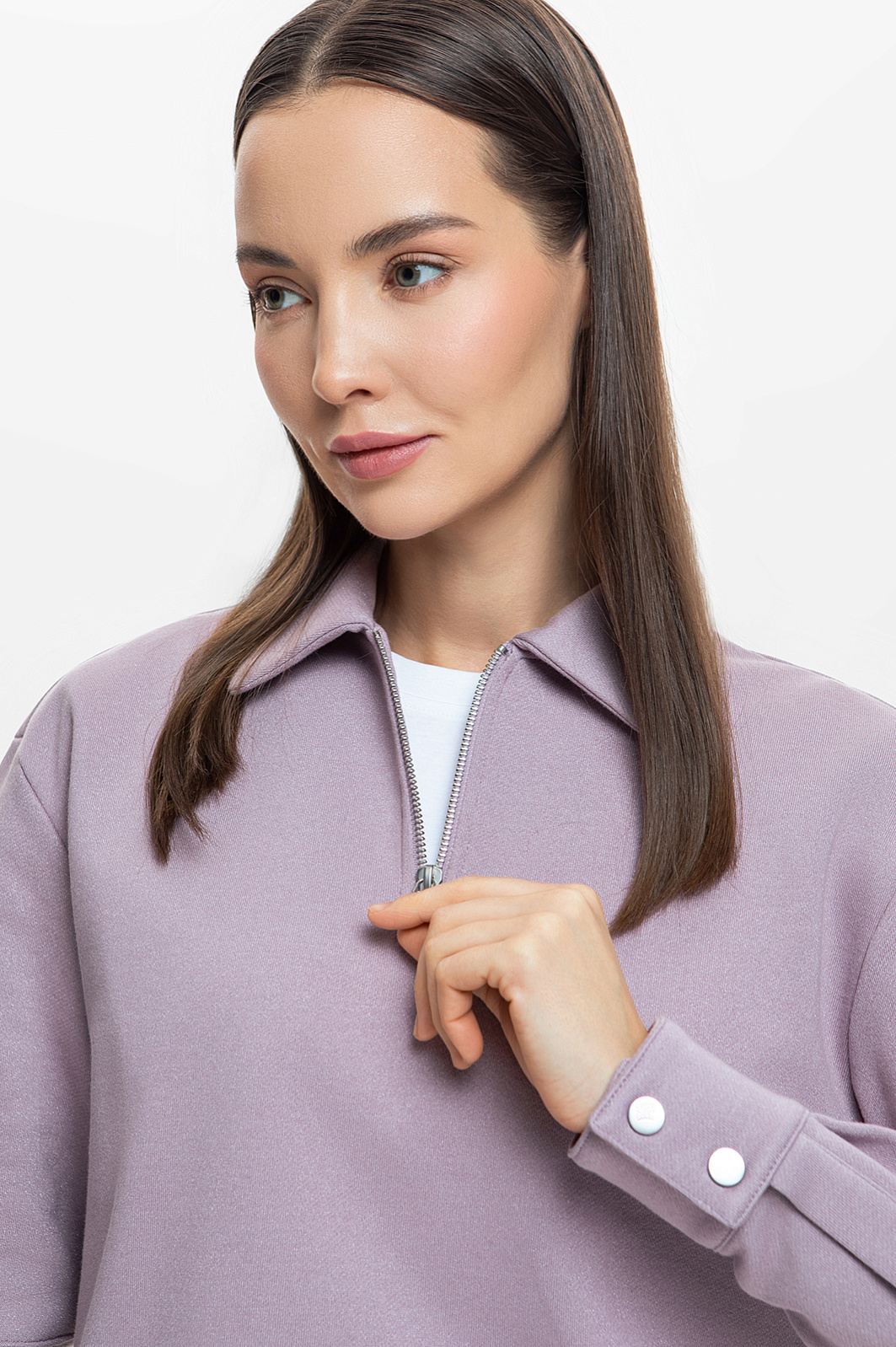 Женская толстовка с воротником поло запоминается с первого взгляда своим утонченным пудрово-сиреневым оттенком. Максимальный комфорт обеспечивает выбранный состав ткани: хлопок гарантирует превосходные дышащие свойства, вискоза добавляет мягкости, а полиэстер – устойчивость к износу. Толстовка идеально прилегает к телу, не сковывая движений, что делает её отличным выбором для спорта и активного отдыха. Лаконичный и стильный дизайн позволяет носить изделие не только на тренировке, но и в повседневной жизни. Рекомендуем дополнить толстовку джоггерами из нашей коллекции. Параметры модели: рост 177, 85-61-92 Размер на модели: S