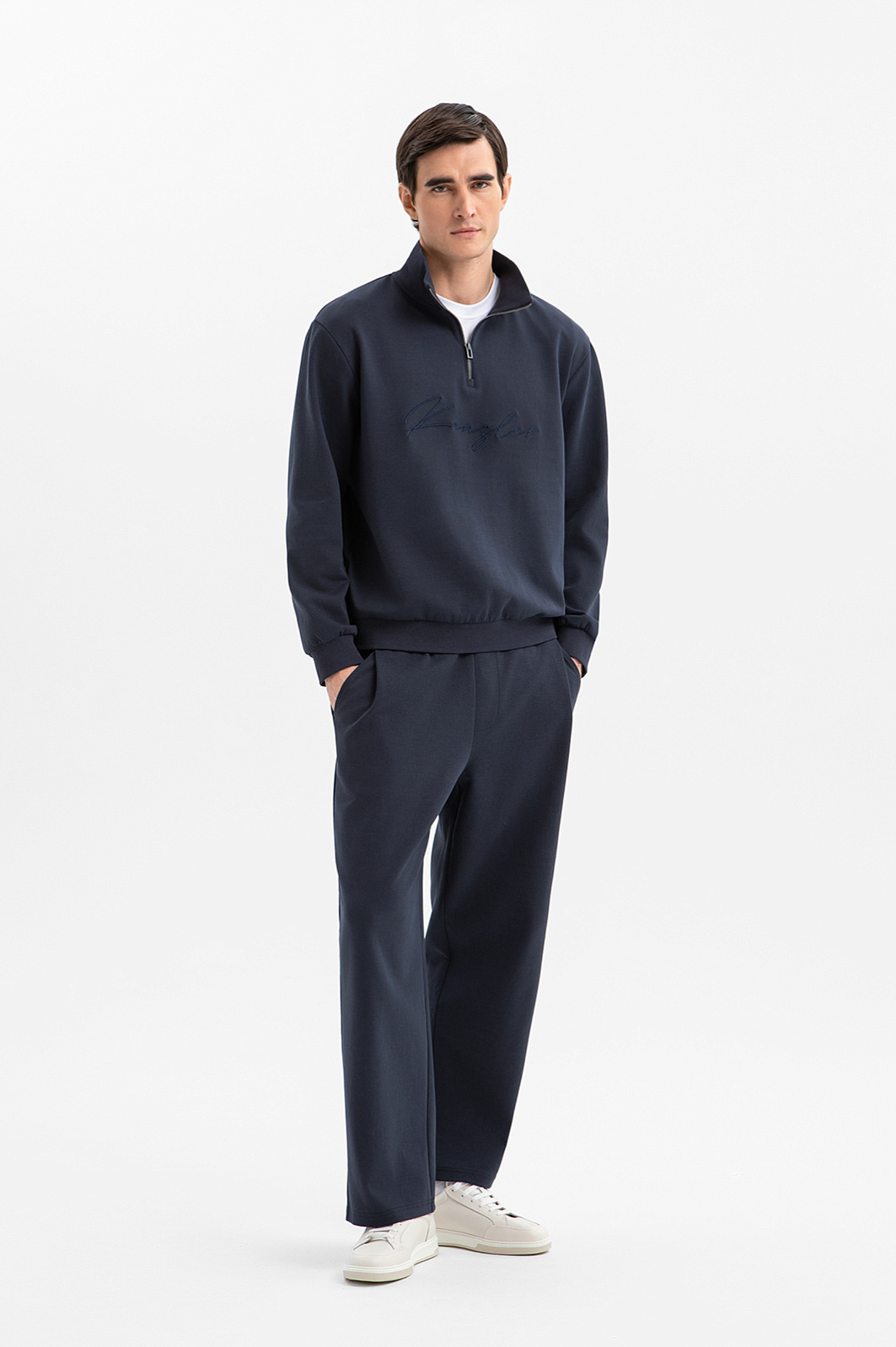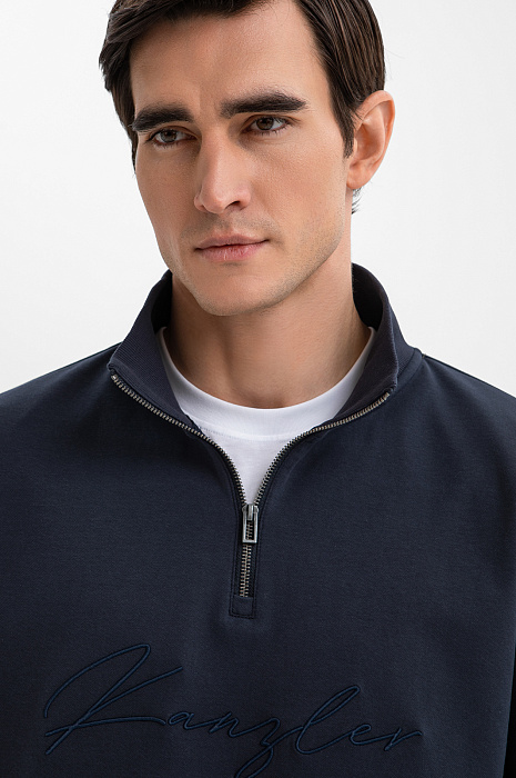 Синяя хлопковая толстовка KANZLER с высоким воротником и молнией до середины груди — выверенный баланс комфорта и современной городской эстетики. Дизайн — минималистичный, монохромный и функциональный. Передняя часть украшена вышитым логотипом в тон. Высокий воротник защищает от ветра и сохраняет естественное тепло, а трикотажные резинки на манжетах и по низу мягко придерживают края при движении, сохраняя форму. Плотный дышащий трикотаж из гипоаллергенного хлопка с добавлением прочного полиэстера и спандекса приятен к телу, устойчив к деформации и сохраняет аккуратный вид даже при активной носке.