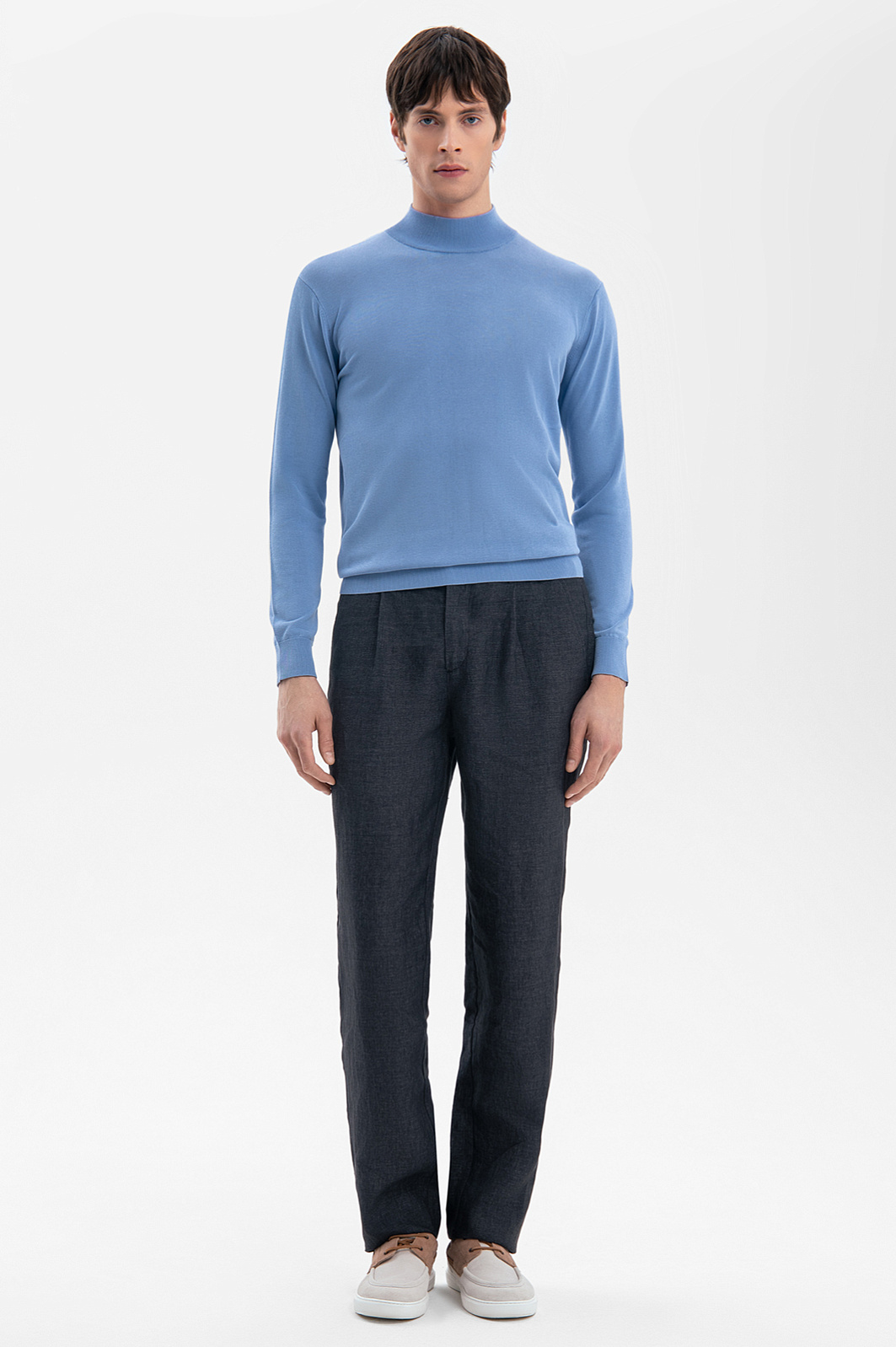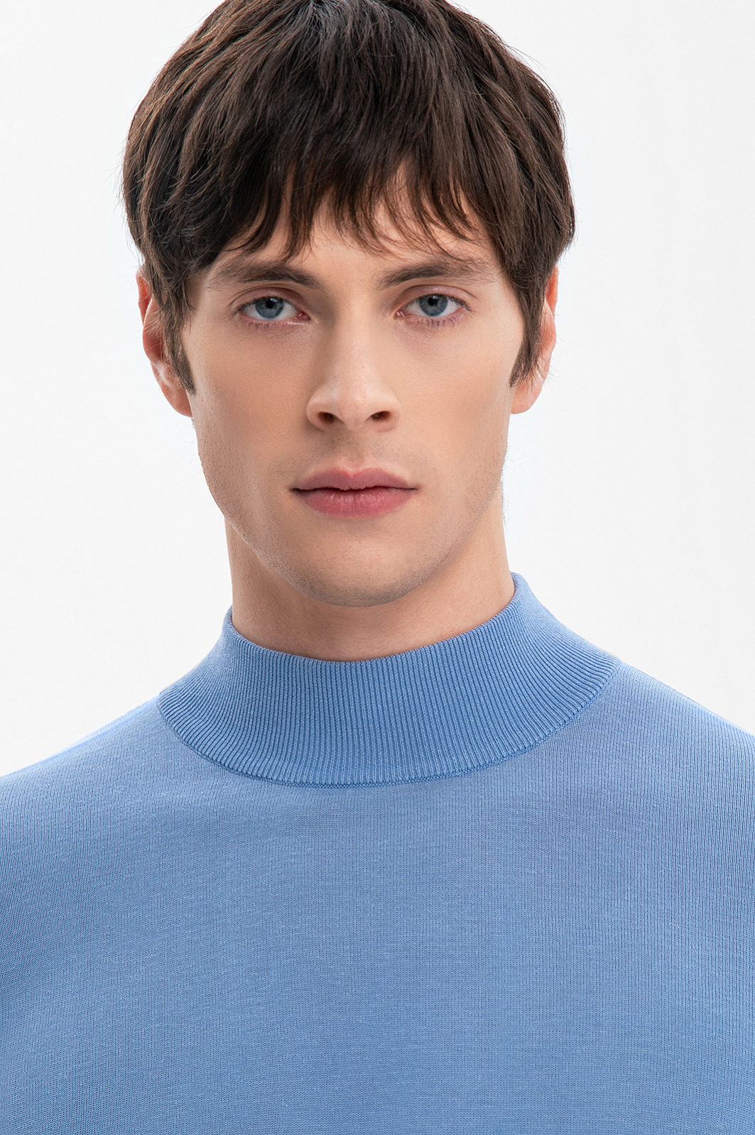 Голубая водолазка из лимитированной коллекции выполнена из 100% шелка. Премиальный материал с гладкой фактурой ощущается на теле как вторая кожа, обеспечивая естественную терморегуляцию: согревает в прохладный день и охлаждает в жару. Натуральные дышащие волокна не вызывают раздражения и подходят даже самой чувствительной коже. Голубой оттенок, глубокий и многогранный, делает водолазку универсальным элементом гардероба, создавая свежий образ. Воротник-стойка и мягкая резинка на манжетах и по низу изделия защищают от ветра и обеспечивают аккуратную посадку по фигуре. Параметры модели: рост 189, 91-78-95 Размер на модели: М