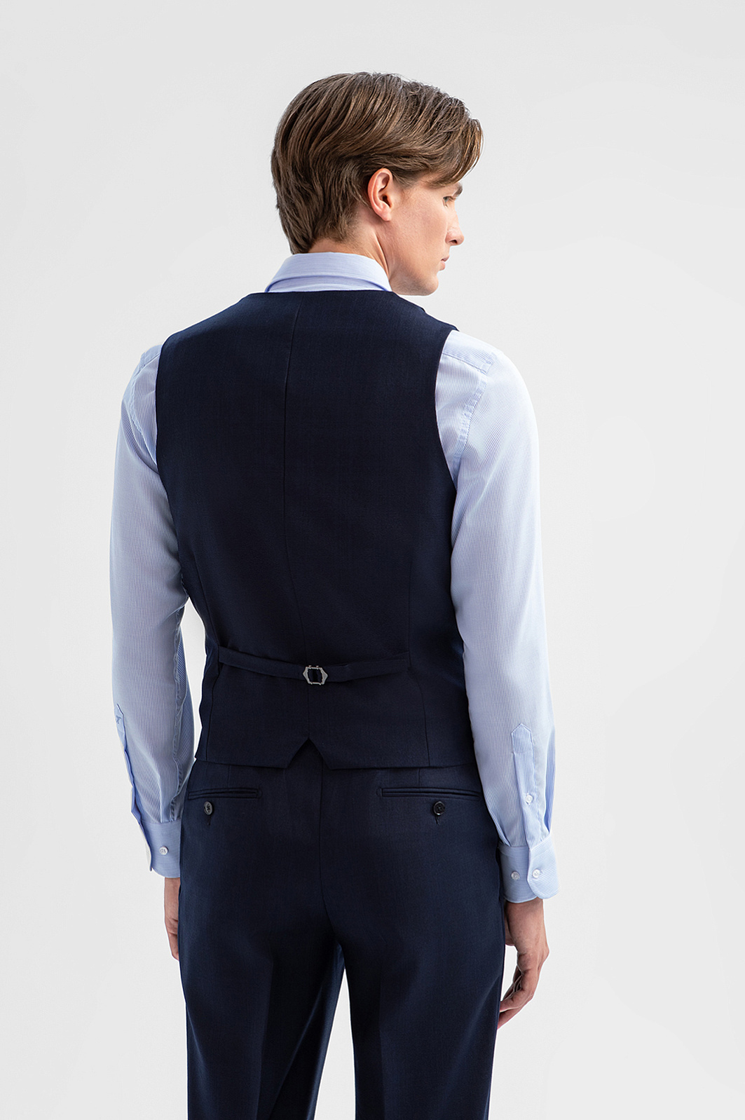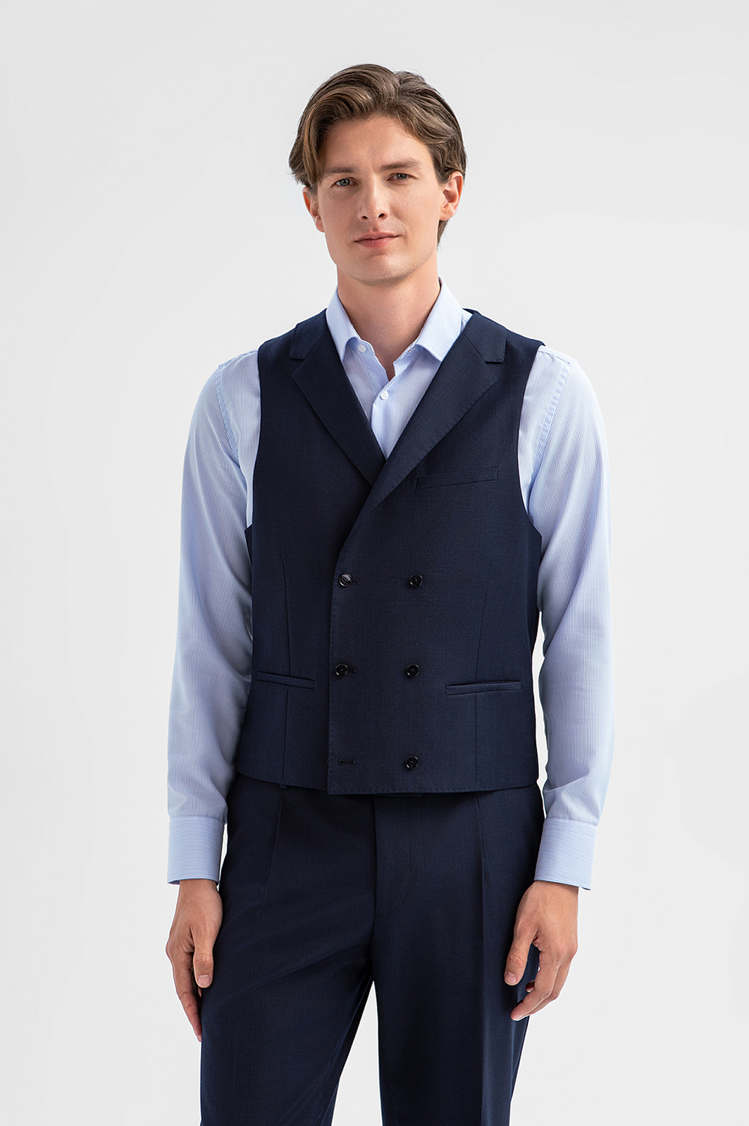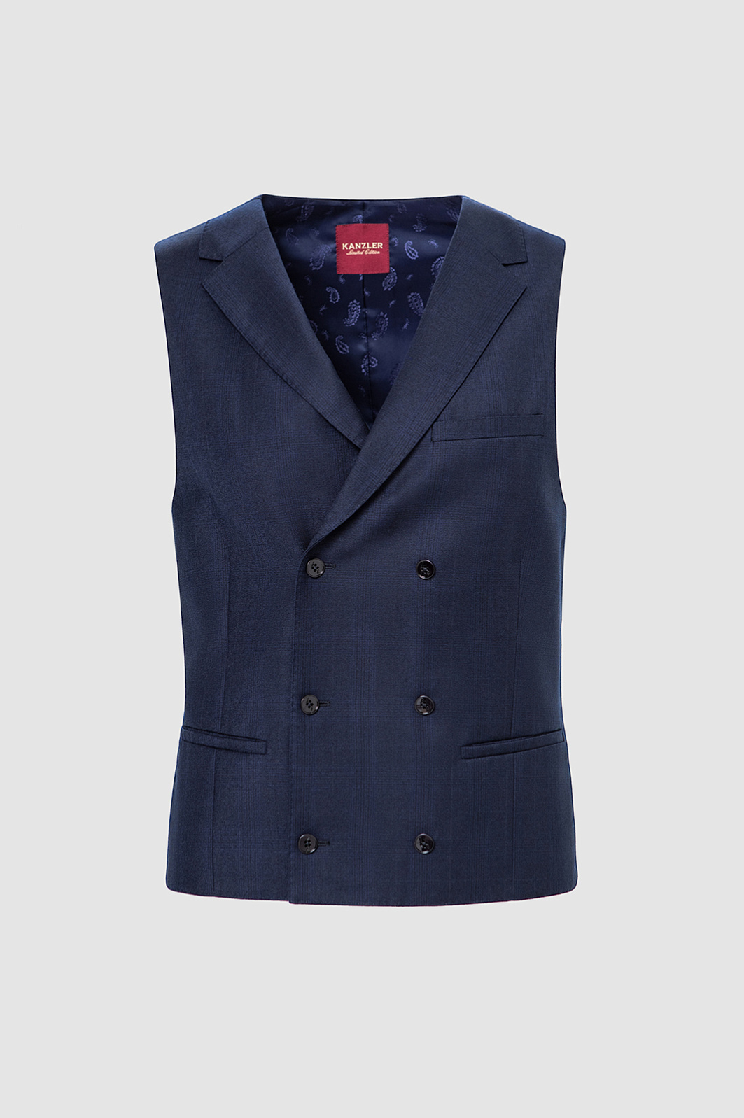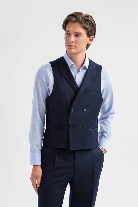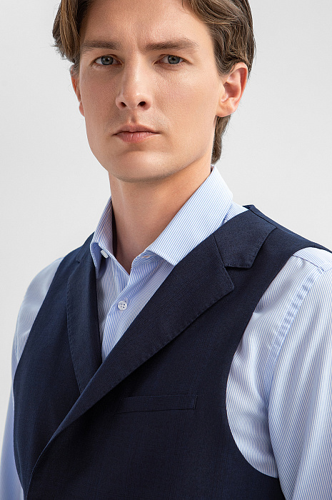 Двубортный тёмно-синий жилет KANZLER из лимитированной коллекции, сшитый из дорогой костюмной шерсти с добавлением нежного кашемира, может быть элементом роскошного костюма-тройки или в неофициальной обстановке заменять пиджак. Это элегантная модель прилегающего силуэта с двумя карманами в рамке и регулируемым ремешком сзади, который позволяет подогнать жилет под фигуру. Дорогая натуральная ткань (90% шерсть и 10% кашемир Супер 130S) с водоотталкивающей обработкой бережёт естественное тепло тела и сохраняет устойчивость к загрязнениям и сминанию. Прочная гладкая подкладка обеспечивает комфорт и лёгкое скольжение при надевании. Параметры модели: рост 191, 97-77-99 Размер на модели: 50
